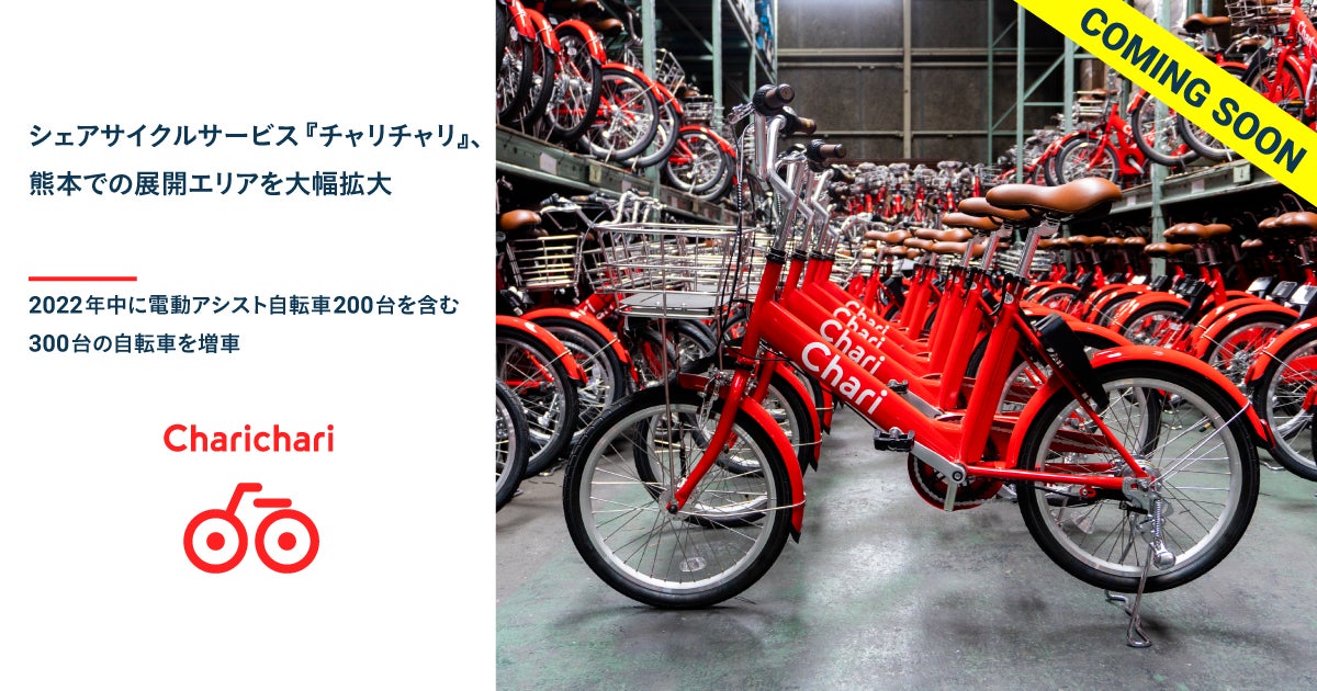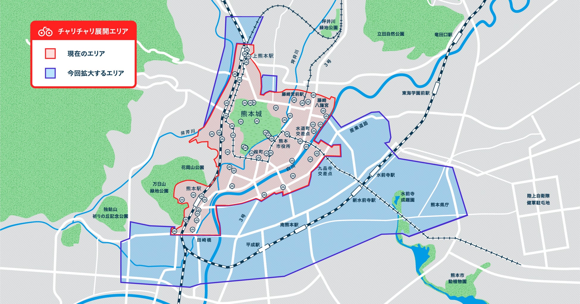 熊本でのサービス開始以降、チャリチャリをご利用いただいた市民の皆さまから「チャリチャリで移動できる範囲を拡げてほしい」との具体的な要望を多くいただいたほか、既にポート設置にご協力いただいている企業の皆さまからも拡大時の協力のご意向をいただけたことから、現時点でチャリチャリが移動利便性向上に寄与できるエリア・ご利用を見込むことが出来るエリアに拡大するものです。