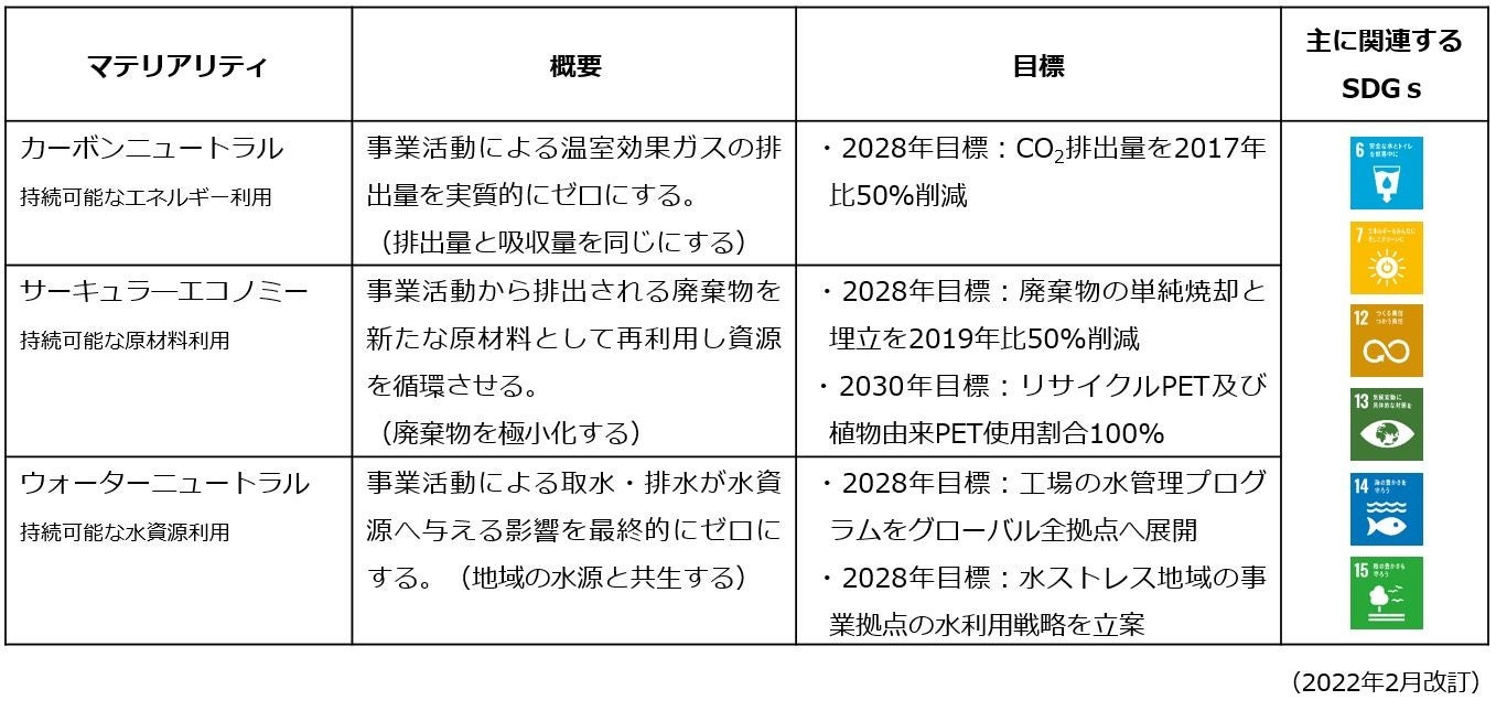 1.2050年環境ビジョン「ネットゼロ」のもと、3つのマテリアリティを特定、また「大塚グループ環境方針」を策定し、グループ協働で取り組んでいます。(大塚グループ環境方針https://www.otsuka.com/jp/csr/environment/)