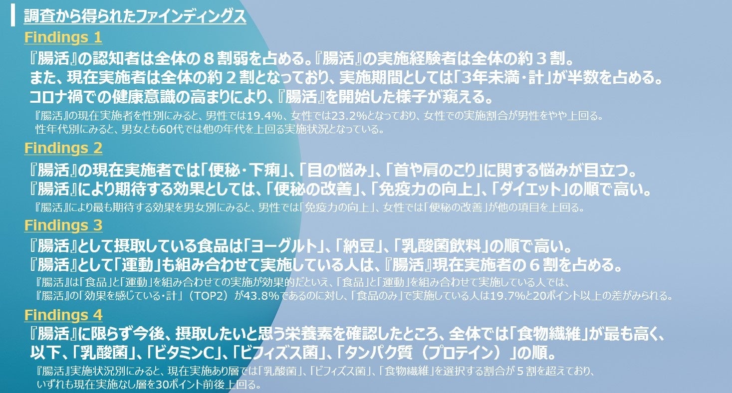 近年、腸内環境を整えることが健康や美容にも良い影響を与えることがわかってきています。腸内環境をより良い状態にするための食事の摂り方や運動、生活習慣の見直しなどを行う、『腸活』という言葉も定着しつつあるようです。特に、「新型コロナウイルス」感染拡大以降、体の免疫力を高めることにより、ウイルスへの感染や重症化リスクの軽減も期待されるといった報道もみられ、『腸活』への期待や関心が続いていると推察されます。