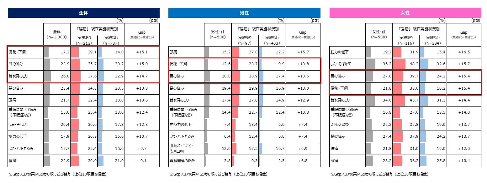 ・性別の結果は下表の通りで、「便秘・下痢」、「目の悩み」は男女ともに<実施あり層>と<実施なし層>の差分が大きくなっています。
