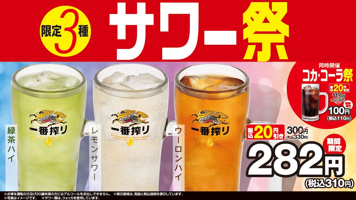 昨年大変ご好評いただいたサワー祭を今年も開催いたします。期間中は「レモンサワー」「緑茶ハイ」「ウーロンハイ」の各種1杯について通常価格から20円引きでご提供いたします。