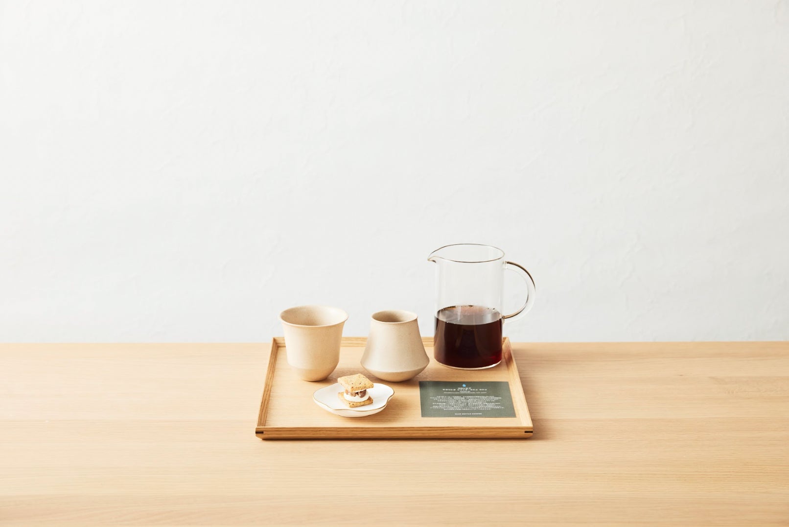 コーヒーの香りをよりお楽しみいただける「KAORI」と、コーヒーを口に含んだ際に、よりフレーバーを感じる事ができる「AJIWAI」の2種類をご用意しています。コーヒー1杯分をカラフェに入れた状態でご提供させていただきますので、ぜひご自身でそれぞれのマグで味の違いをお楽しみください。またヘーゼルナッツとマロングラッセを合わせた濃厚なバターサンド「栗のバターサンドクッキー」をセットでご用意いたしました。サブレにはサンドした栗の風味がより引き立つよう、ヘーゼルナッツパウダーを混ぜ込みバタークリームにラム酒を加えました。一口で口いっぱいに秋の風味が広がる味わいを、ここでしか味わえない特別な空間のなかで心ゆくまでコーヒーを堪能いただけます。