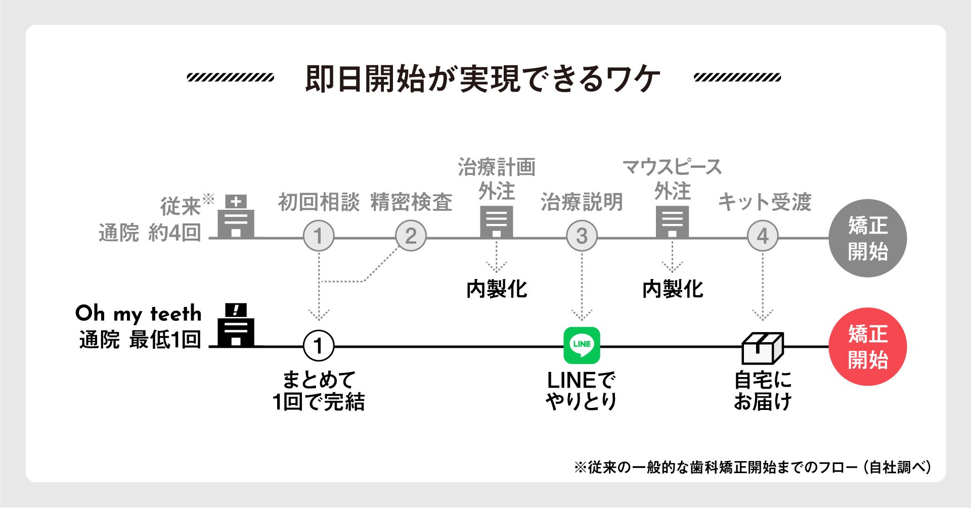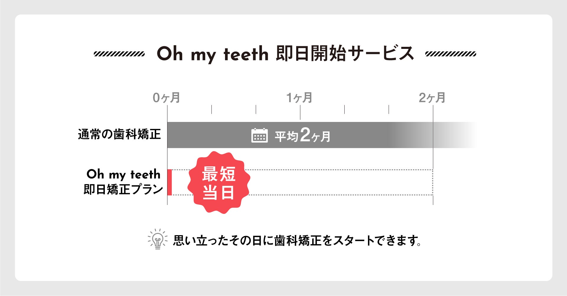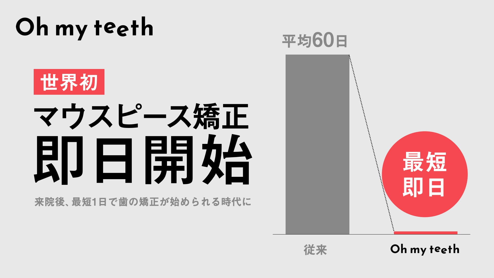 この度、「即日開始」という新たなコンセプトを発表します。一般的な歯科矯正の場合、来院初日から矯正開始は2ヶ月ほどかかるところ、Oh my teethでは最短1日で開始することが可能になります。