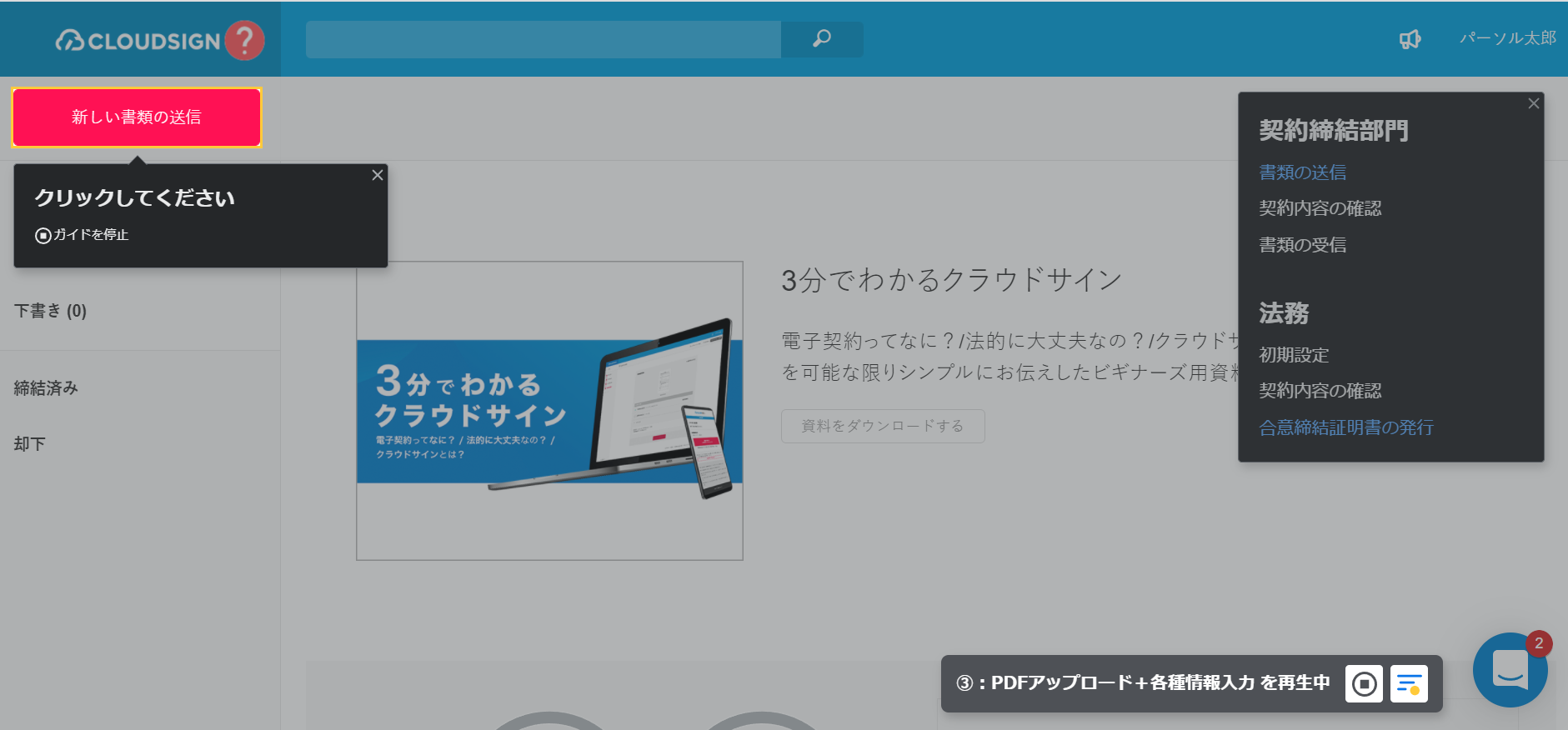 テックタッチのナビゲーションが表示されているクラウドサイン画面