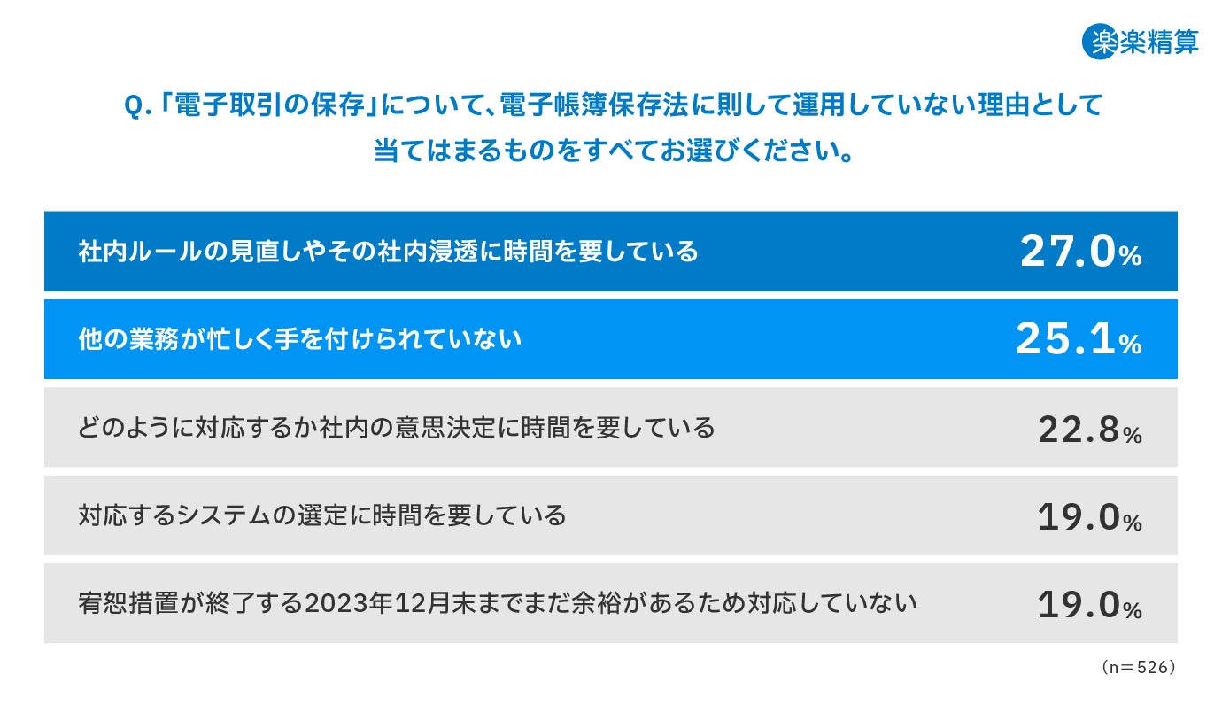 ■電子帳簿保存法における「電子取引データの保存」*1に則した運用をしていない理由の最多回答は「社内ルールの見直しやその社内浸透に時間を要している」