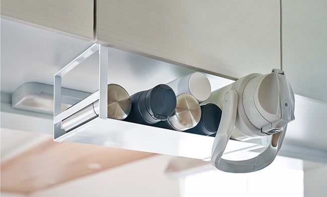 置き場所に困るワイドジャグボトルやマグボトルを戸棚下に並べて収納できる便利な収納ラック。