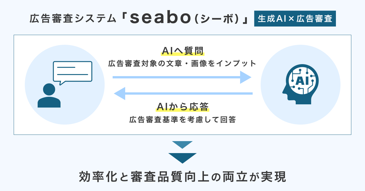 『seabo』は、各種法規制や社内独自の審査基準を基に各広告媒体での画像データ内の文字を判読し、広告の審査判定結果の文章生成まで、一連の広告審査プロセスを自動化します。これにより、広告審査業務の効率化と従業員のスキルに左右されにくい審査精度・品質の向上を実現するほか、人手に加えて生成AI(GPT)が運用データに基づき継続的な最適化を行うことで、持続的な審査品質の向上が見込めます。