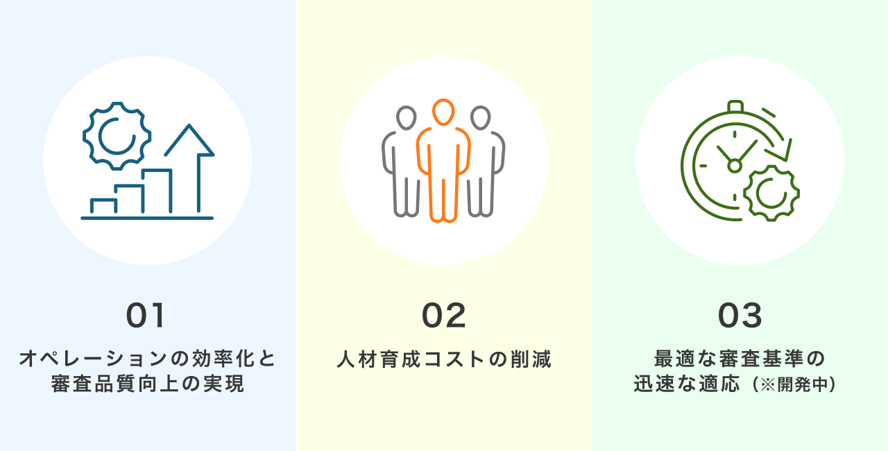 審査基準のアップデートや審査基準の追加および削除など、細かな変更にも正確で柔軟、かつ迅速に対応できるように、審査基準の最適化を行う機能を開発中です。これにより、最新の情報への迅速な適応が期待できます。