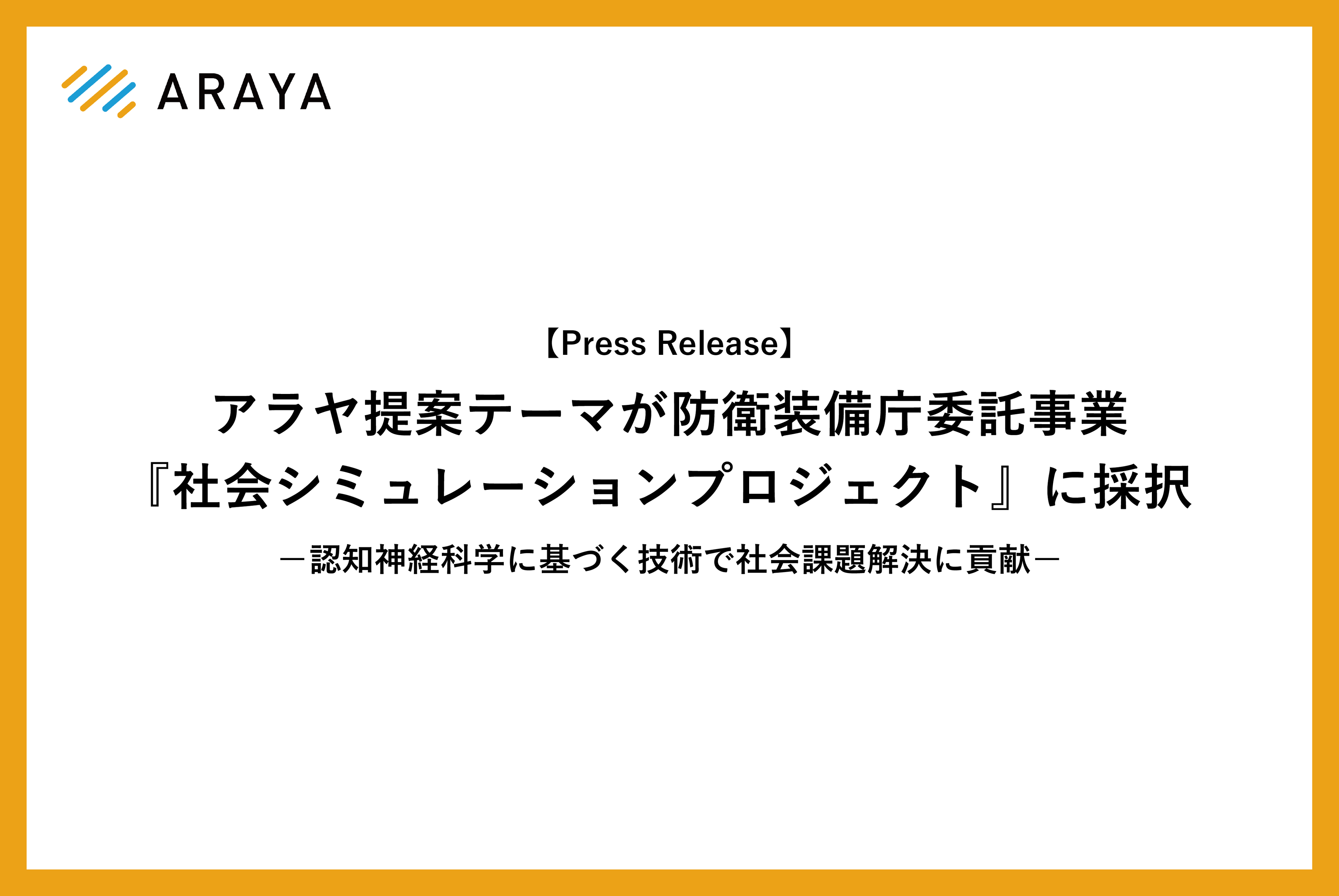 株式会社アラヤ(所在地:東京都千代田区、代表取締役:金井良太、以下「アラヤ」)NeuroAI事業部ペルソナラボは、防衛装備庁 防衛イノベーション科学技術研究所より委託を受けて実施される「社会シミュレーションプロジェクト」において、採択企業の一つとして選定されたことをお知らせいたします。
