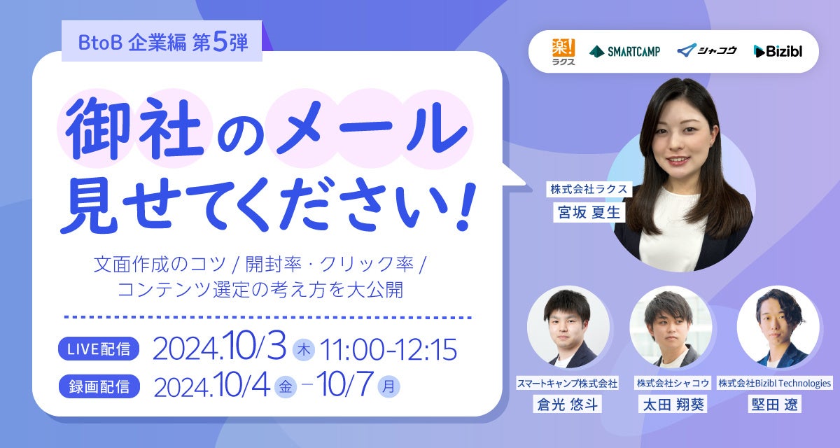 株式会社ラクス(本社:東京都渋谷区、代表取締役:中村 崇則)が提供するメールマーケティングサービス「配配メール」は、2024年10月3日(木)11時より、メール施策にお悩みの法人営業・マーケティングご担当者様向けオンラインセミナー「御社のメール見せてください!! BtoB企業編 第5弾」を開催いたします。