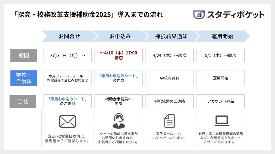 本補助金を活用した「スタディポケット」の導入は、下記のスケジュールでのご案内となっております。導入相談から申請サポート、運用開始後の伴走支援まで一貫してご支援いたします。