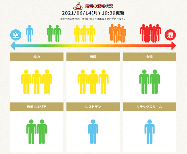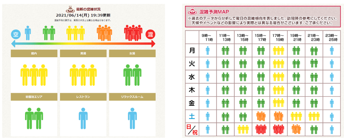 混雑状況リアルタイム表示は、風呂場以外に「サウナ」や「休憩所」の表示なども可能です。時間帯によって集中するレストランの混雑状況などにも最適、様々な業態に対応ができます!また施設の混雑状況をサイト上に表示させて、お客様へ空いている時間帯をご案内できます。