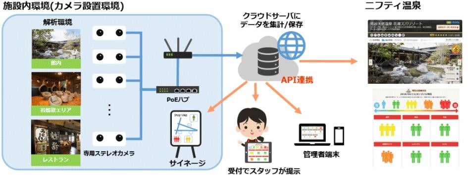 本サービスは館内主要箇所の入り口(脱衣所、休憩所・食事処など)にステレオカメラを設置し、場所ごとの利用人数をリアルタイムでカウントすることで混雑状況を確認できる、シンプルかつ便利なシステムです。