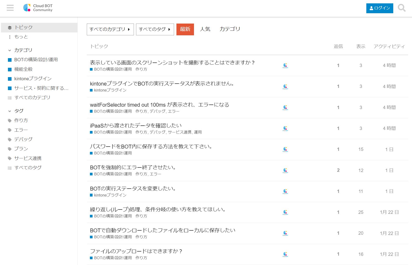 ・トピックの作成・返信を行うには、クラウドBOTへのログインが必要。