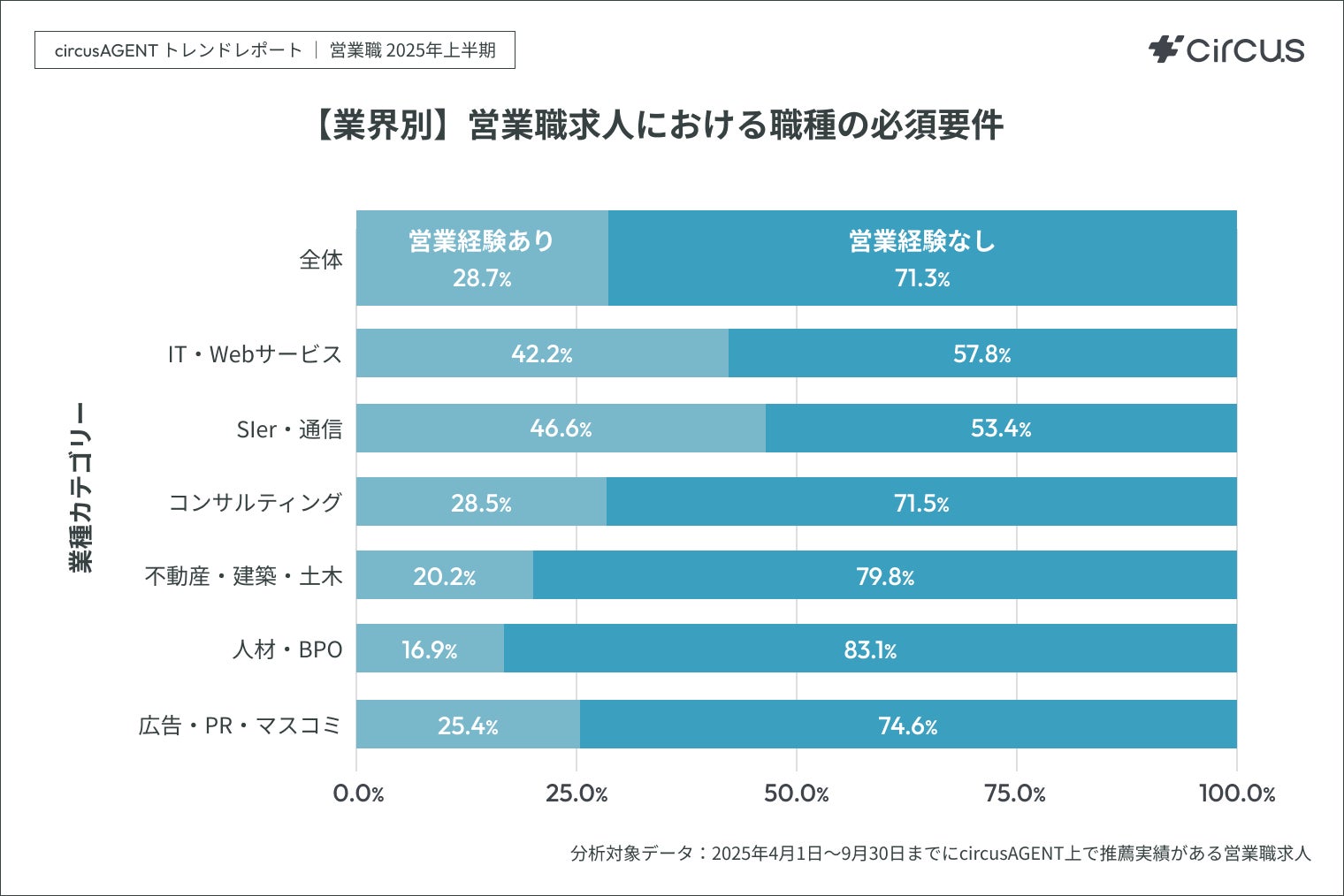 営業職の求人では、全体で約7割(71.3%)が未経験者も応募可能な結果となりました 。営業職において、職種未経験者の採用を積極的に行っている企業が多いことを示しています。一方で、経験者向け求人は約3割(28.7%)となりました。業界別に見ると、その傾向は大きく異なっています。