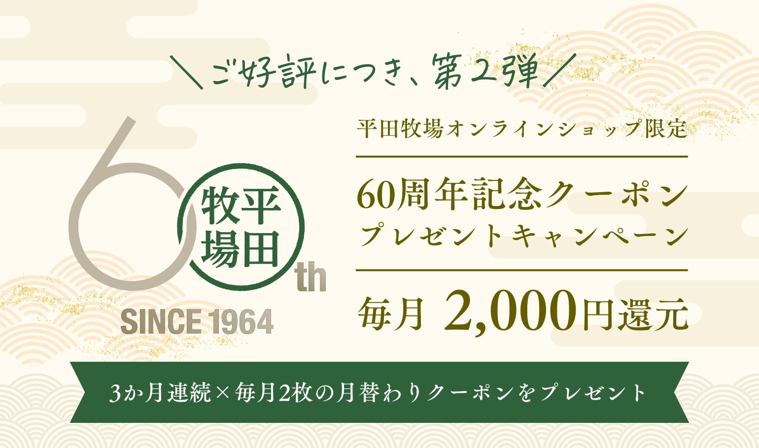 おかげさまで60周年、60年分の感謝を込めて、平田牧場公式オンラインショップの全会員様に、2024年10月、11月、12月の各月2,000円分、総額6,000円分の割引クーポンをプレゼントします。