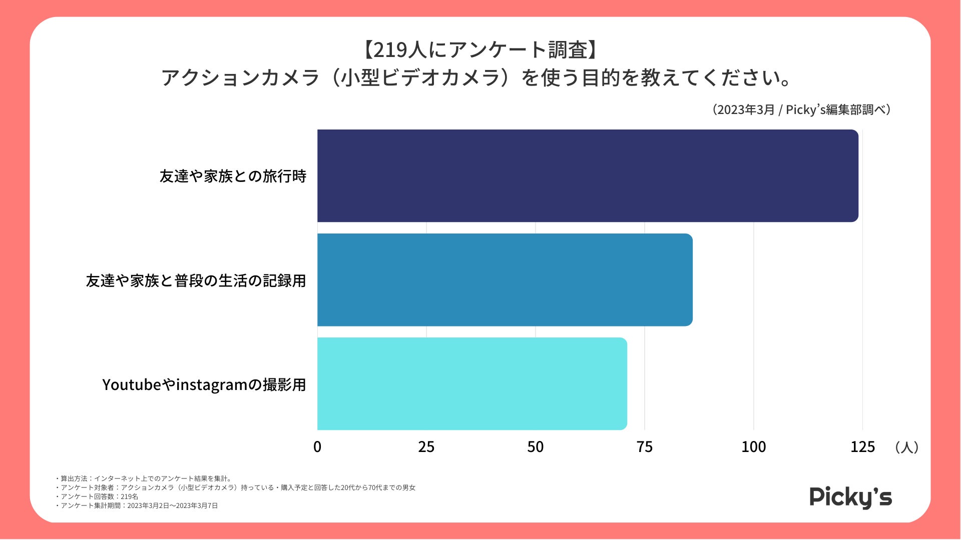 「Picky’s」は、インターネットショッピングにおいて、購入前に試せない・選ぶべきものがわからないという課題の解決を目標に、あらゆる商品のおすすめランキングや検証レビューを紹介するサイトです。このたびPicky’s(https://rentry.jp/note/)では、2023年3月21日アクションスポーツの日に先駆けて、アクションカメラ(小型ビデオカメラ)についてインターネット上でアンケート調査を行いましたので発表いたします。