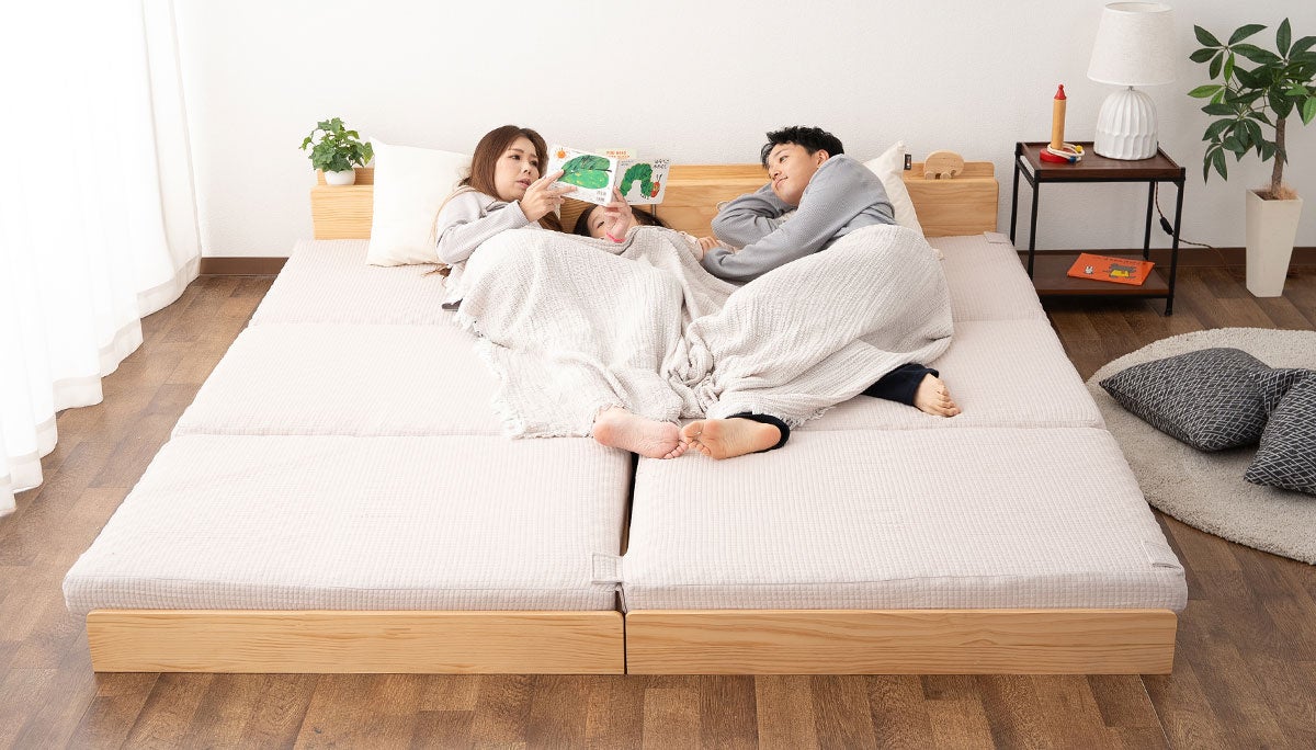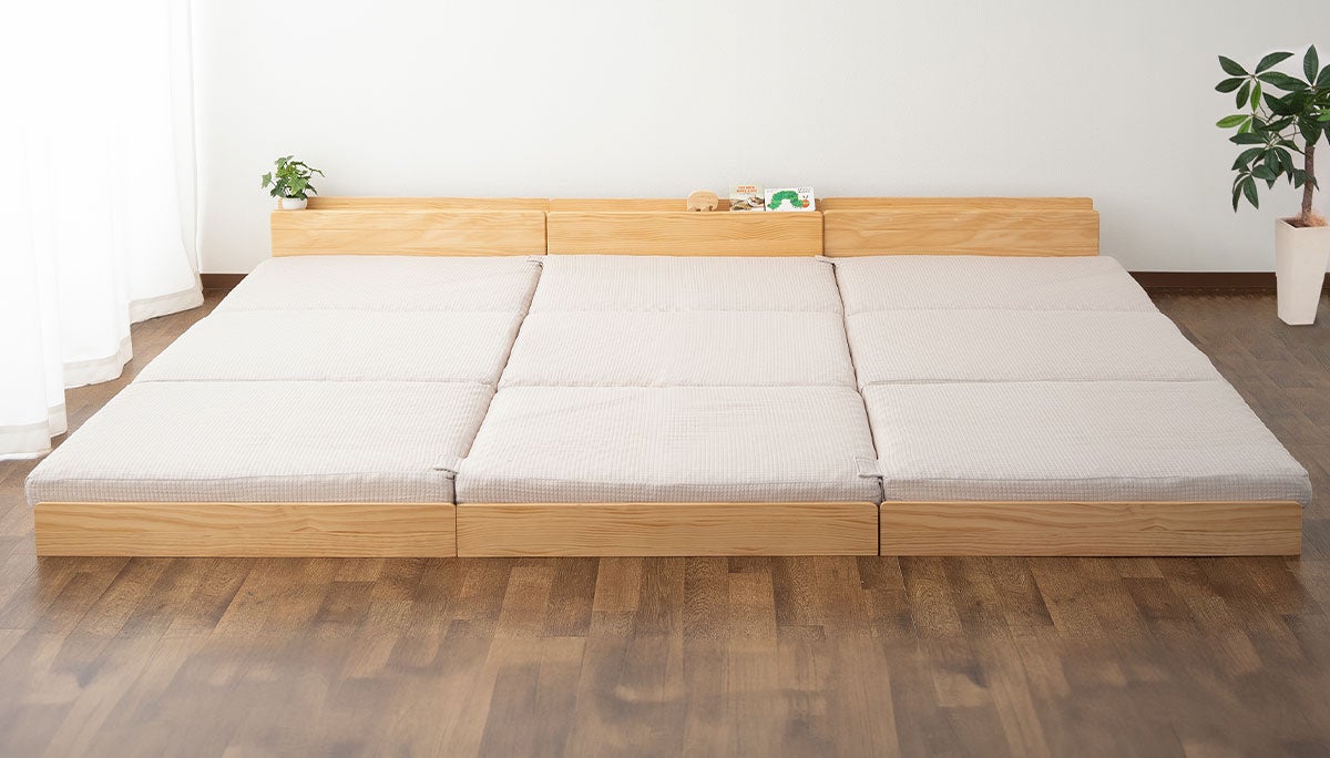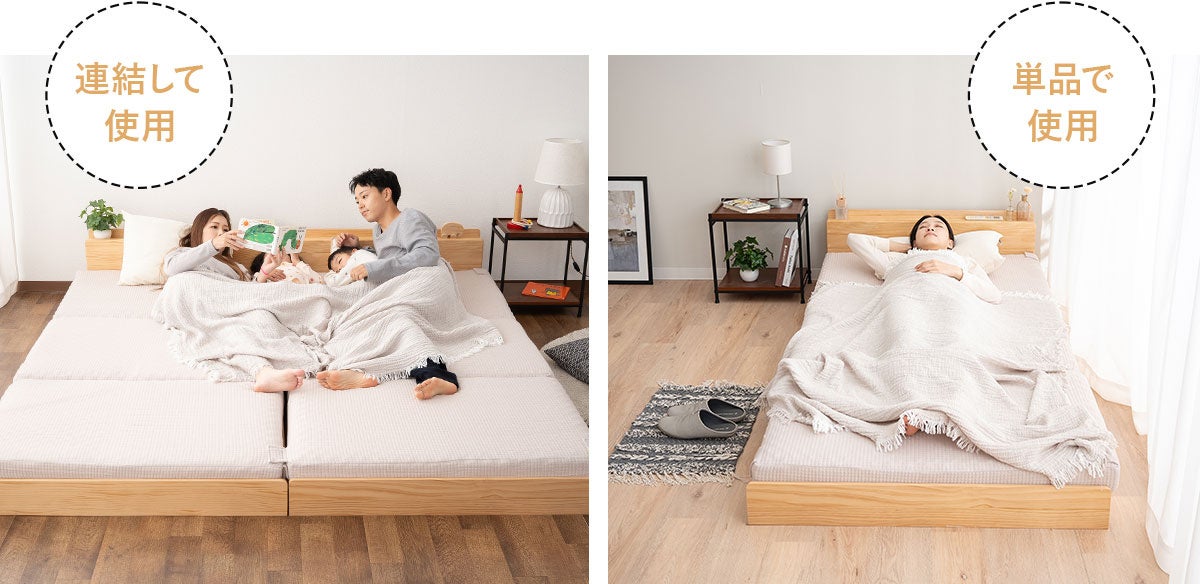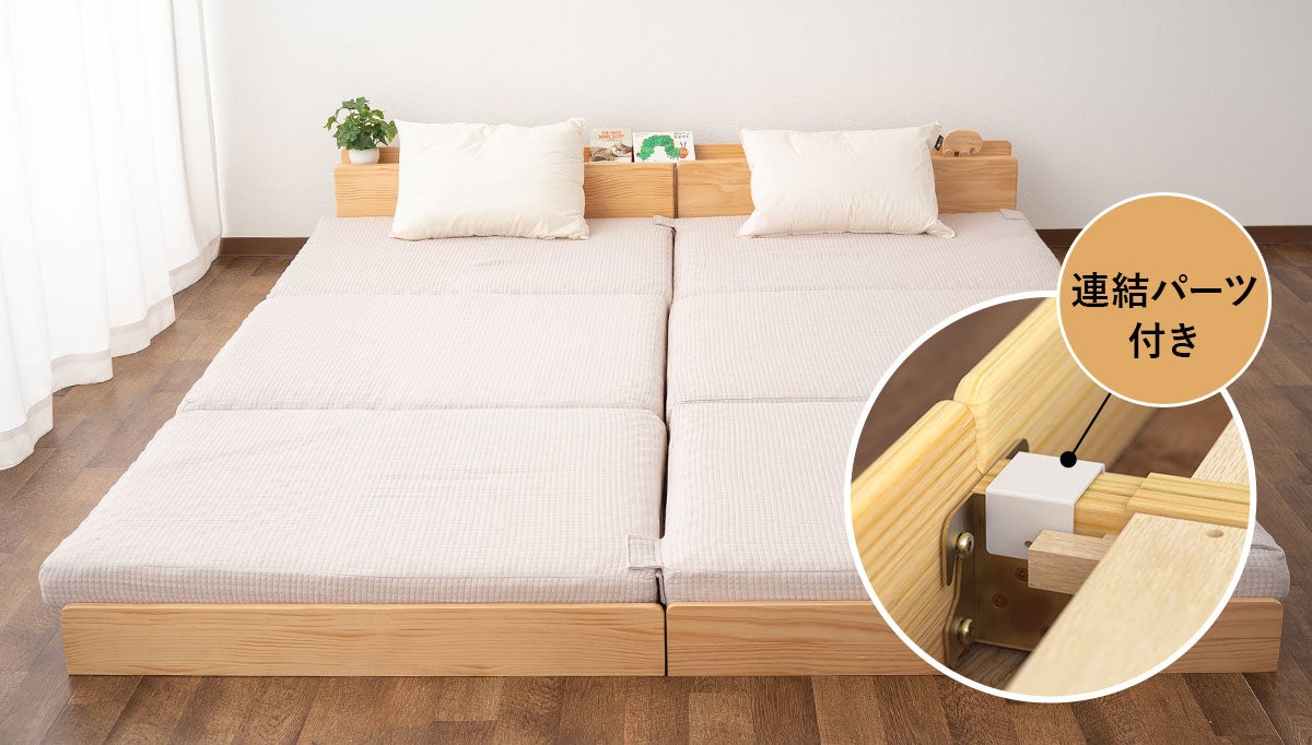 家族みんなでゆったり眠れるファミリーサイズに連結できるローベッド