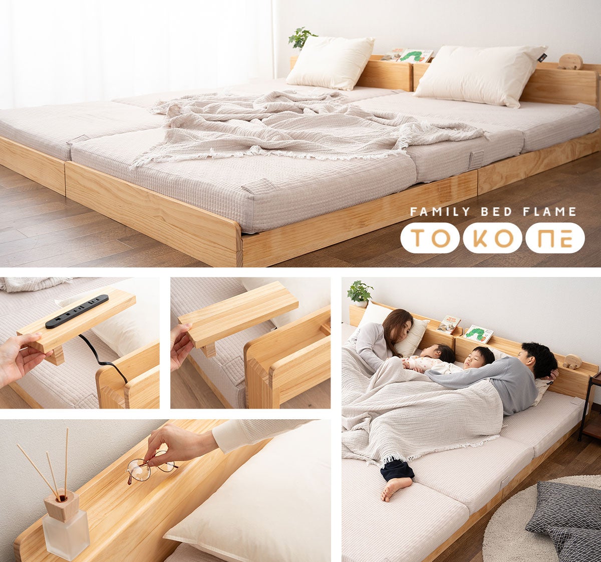 家族の成長に合わせて形を変える!ファミリーサイズに連結できるローベッド『TOKONE-トコネ/ファミリーベッドフレーム』の先行予約販売を開始