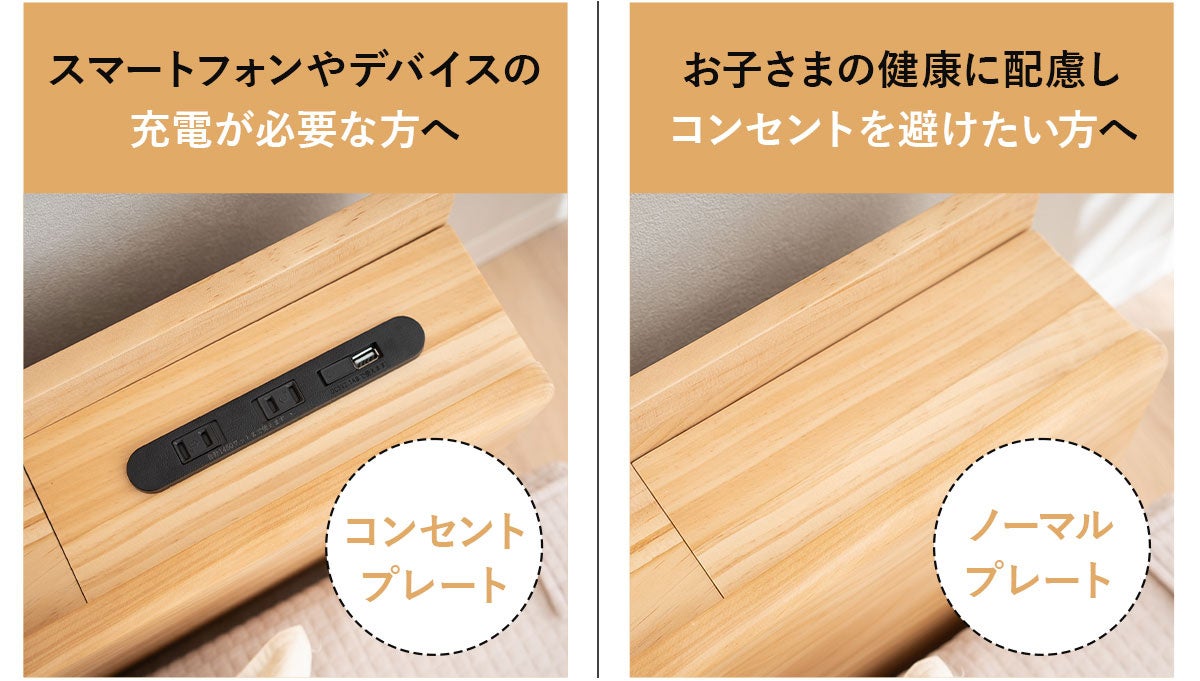 睡眠環境にこだわりたいお客様のために、ヘッドボードに付け替え可能なプレートを2種ご用意しました。組み立て時にお好みに合わせて簡単に付け替えが可能です。
