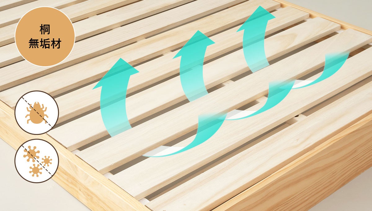 すのこ板には軽くて調湿機能を持つ天然桐材を使用しており、優れた通気性を実現。湿気がこもりにくく、マットレスの通気性を保つため、カビやダニの発生を防ぎ、長時間快適な睡眠環境を提供します。