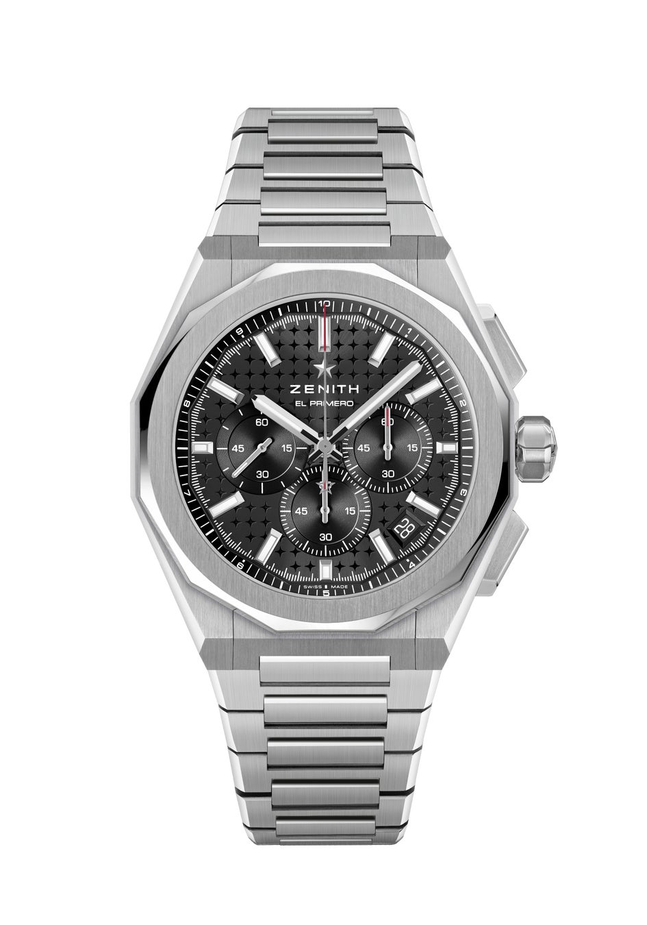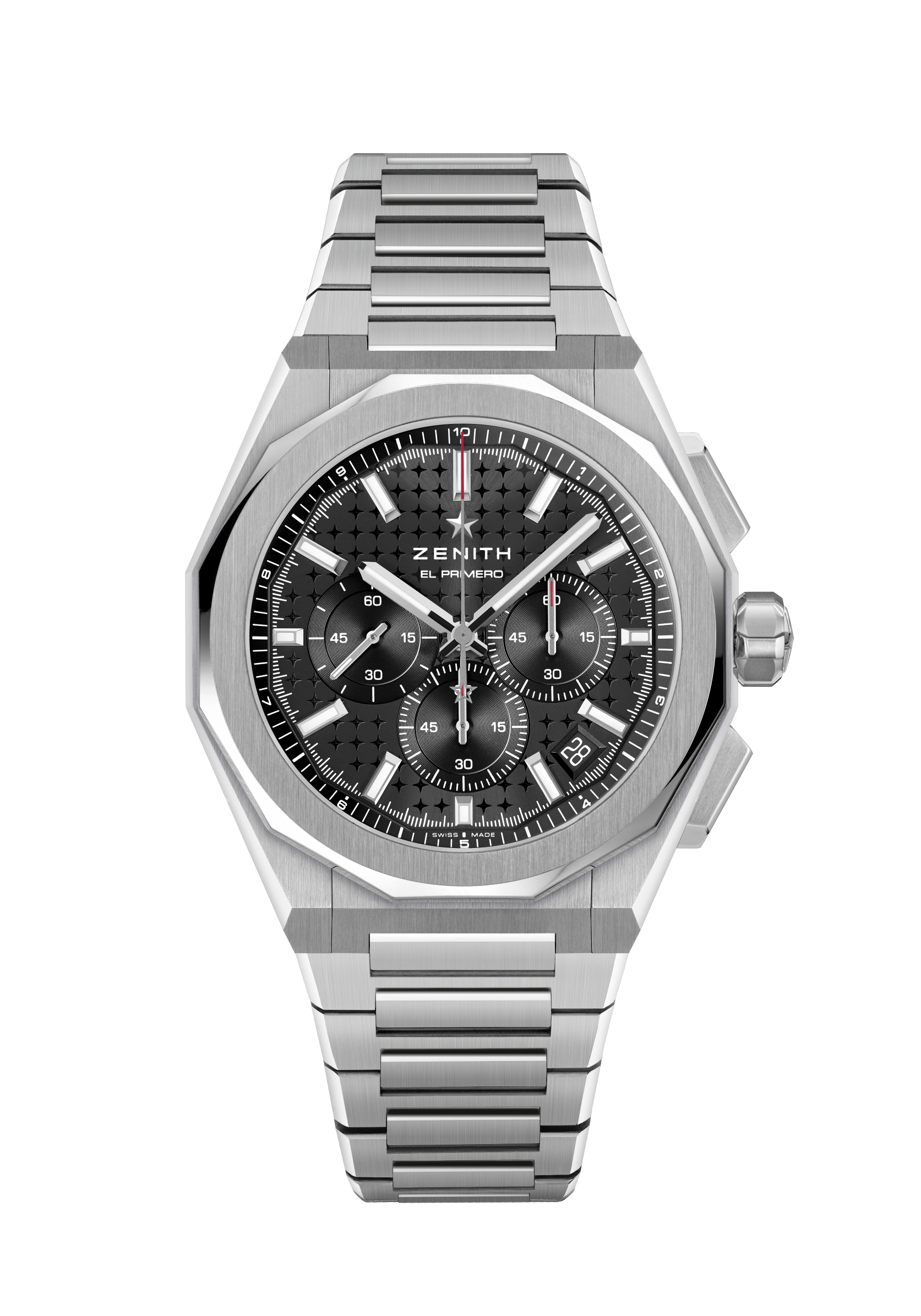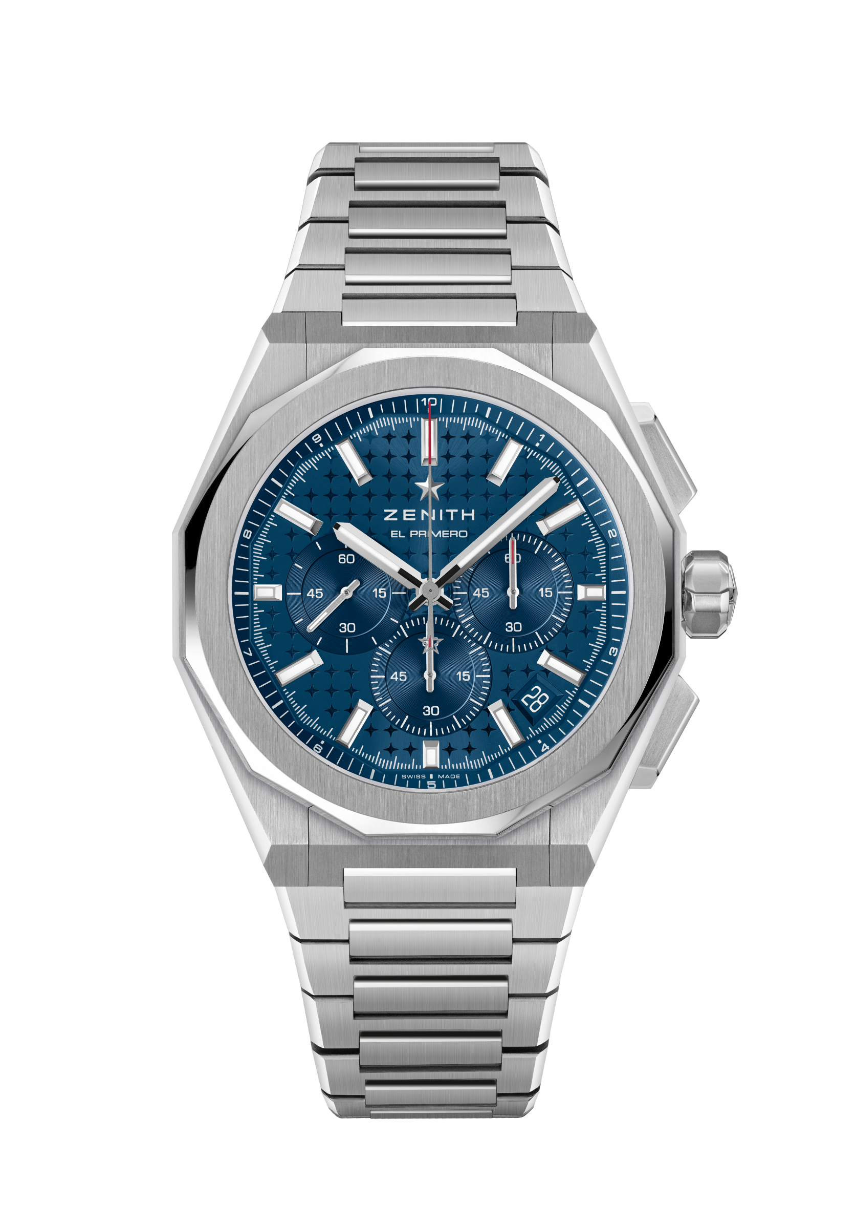 メタリックなブラック、ブルー、シルバーの文字盤には4つの点を結んだ星のエングレービングでコレクションのシグネチャーの星空が描かれるとともに、エル・プリメロ伝統の文字盤デザインが採用されています。3つの大きなクロノグラフカウンターはわずかに重なり合い、クロノグラフの秒・分積算計とスモールセコンドを備えています。文字盤と色を合わせた日付表示は、これもエル・プリメロの特長である4時半位置に配置されています。1/10秒単位のスケールが刻まれたフランジリングは、12角形のベゼルとリンクする12面のファセットを備え、アワーマーカーの延長として機能します。