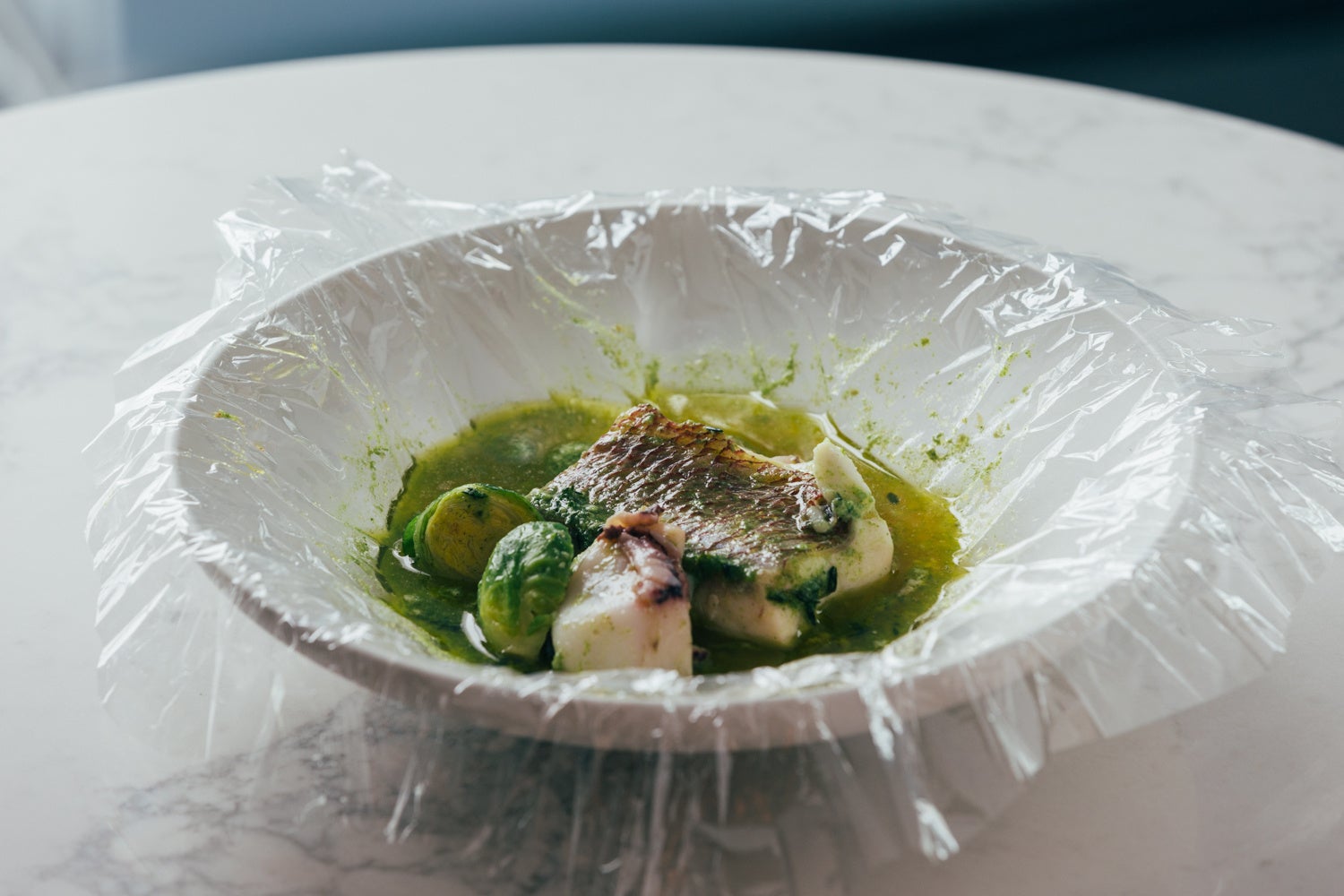 熊本県天草の鮮魚店「本田屋」から仕入れる天然桜鯛を使用したメニュー。血抜きをしてから10日間寝かせても刺身として食べられるほどの鯛は、まるで昆布や出汁のような味わい。あえて包み焼きにし、その旨みをスープに閉じ込めました。ボリューム感のある包みを開けると春らしい香草バターの香りが広がり、また噛み締めると鯛の出汁の風味が楽しめます。
