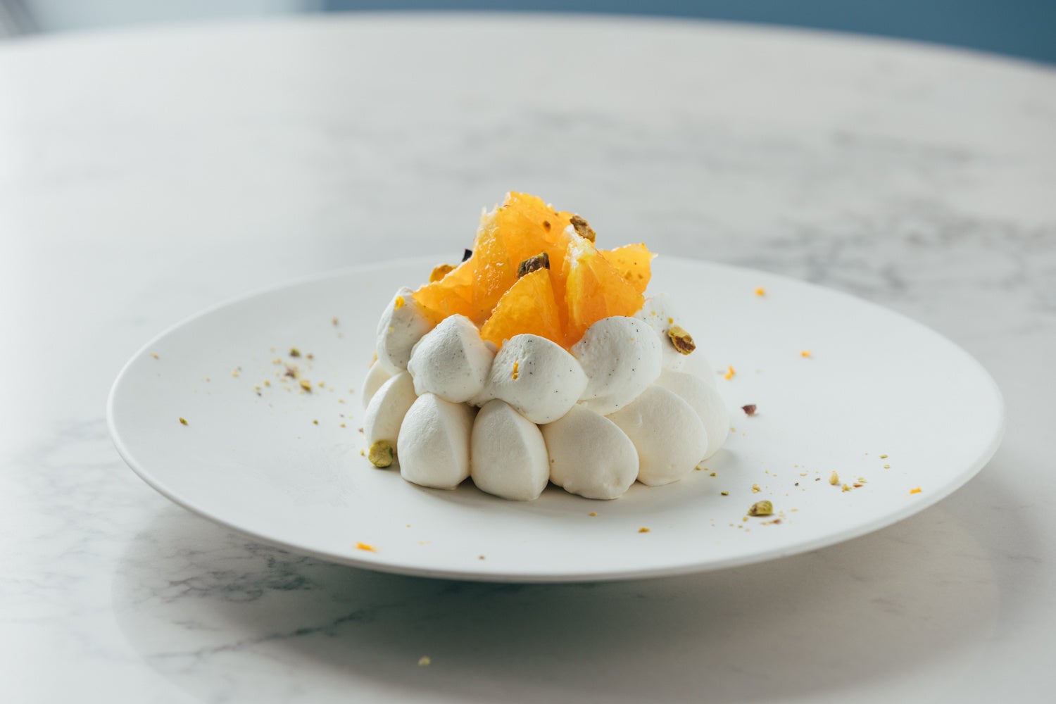 まるでゼリーのようにジューシーでつるんとした食感が楽しめる佐賀県唐津の柑橘農家「シトラスプラス」のデコポンを半玉使用。フルーツ自体がデザートと言えるような甘みと、程よい酸味が特徴です。丁寧に薄皮を取り除いた果肉は、とろけるような食感。サクサクのメレンゲと、ジャージー牛乳のミルクジェラート、ローストしたピスタチオのソースと合わせ、味の変化を楽しむことができます。