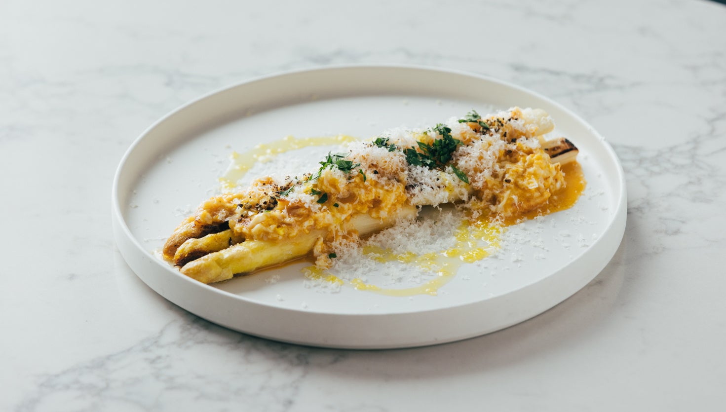 高知県の土佐ジローの卵を使用した黄金のソースを楽しんでいただきたい一品。水溶性卵白が少なく濃厚な卵黄の味わいを残すため、焦がしバターで炒めながらも、半生の状態で仕上げています。春の訪れを感じるホワイトアスパラガスのソテーと合わせてお楽しみください。