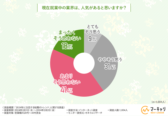 「現在就業中の業界は、人気があると思いますか?」と質問したところ、『とてもそう思う(9.1%)』『ややそう思う(31.4%)』『あまりそう思わない(41.4%)』『まったくそう思わない(18.1%)』と回答しました。