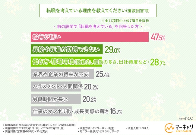 前の質問で「転職を考えている」と回答した方に「転職を考えている理由を教えてください(複数回答可)」と質問したところ、『給与が低い(47.5%)』と回答した方が最も多く、『昇給や昇進が期待できない(29.0%)』『働き方・職場環境(勤務先、転勤の多さ、出社頻度など)(28.7%)』と続きました。