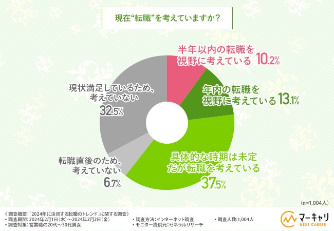 そこで「現在“転職”を考えていますか?」と質問したところ、『半年以内の転職を視野に考えている(10.2%)』『年内の転職を視野に考えている(13.1%)』『具体的な時期は未定だが転職を考えている(37.5%)』と回答しました。