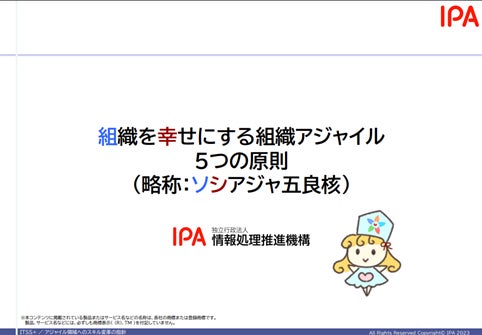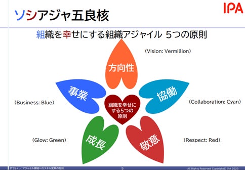 「個人や組織が輝き続けるために、さまざまな局面で組織自身がその存在理由をあらためて見直し、組織として意味のある機能を果たしていることが求められます。この「組織を幸せにする組織アジャイル 5つの原則(略称:ソシアジャ五良核)」は、こうしたさまざまな変化の中で、組織や個人がどのように取り組めばよいかについて「考えるヒント」となるものです。」(IPAのHPより抜粋)