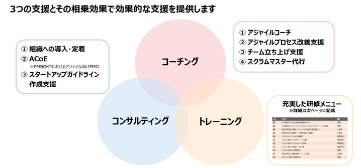 MSOL Digital®のサービスの一つであるアジャイル支援は、コーチング、コンサルティング、トレーニングの3つのサービスを柱にしており、この3つのサービスをシームレスに提供することにより、相乗効果を生み出し、効果的な支援を展開しております。