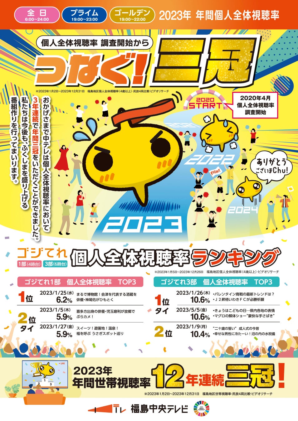 それによると、福島地区では福島中央テレビ(⽇本テレビ系列・中テレ)が、個⼈全体視聴率(4歳以上)において、全⽇(6時〜24時)4.2%、ゴールデン(19〜22時)8.0%、プライム(19〜23時)7.2%で、3つの時間帯すべてで1位となり、年間の視聴率三冠を獲得した。