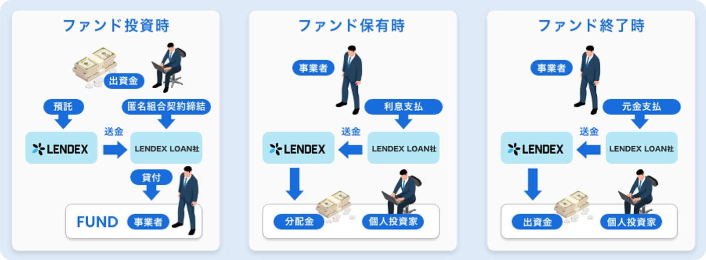 投資家様の資産を適正に守るため、LENDEXに代わって投資家様の出資金を事業者(融資先)に貸付を行う株式会社LENDEX LOANを設立し投資家様の資金を分別管理。毎月の利息の回収、元本の回収もLENDEX LOANが行いLENDEXを経由し、投資家様へお支払いいたします。