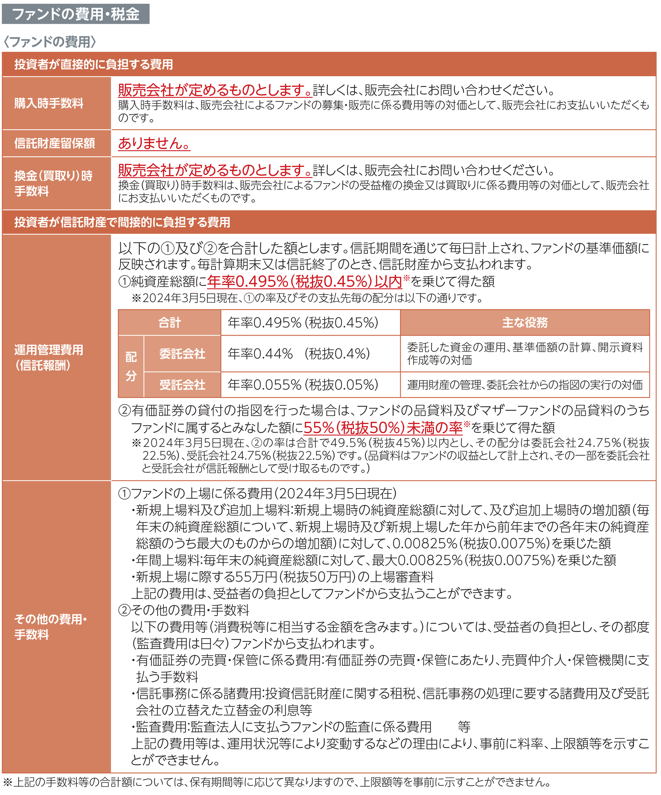 (注)上記のファンドの費用のうち、「投資者が直接的に負担する費用」は販売会社を通じて申込みをする場合の記載であり、東京証券取引所で売買をされる場合の取扱いは異なります。取引所における売買時にお客様に直接ご負担いただく費用(売買委託手数料)は、取扱証券会社が独自に定める手数料となります。詳しくは取扱証券会社にお問い合わせください。