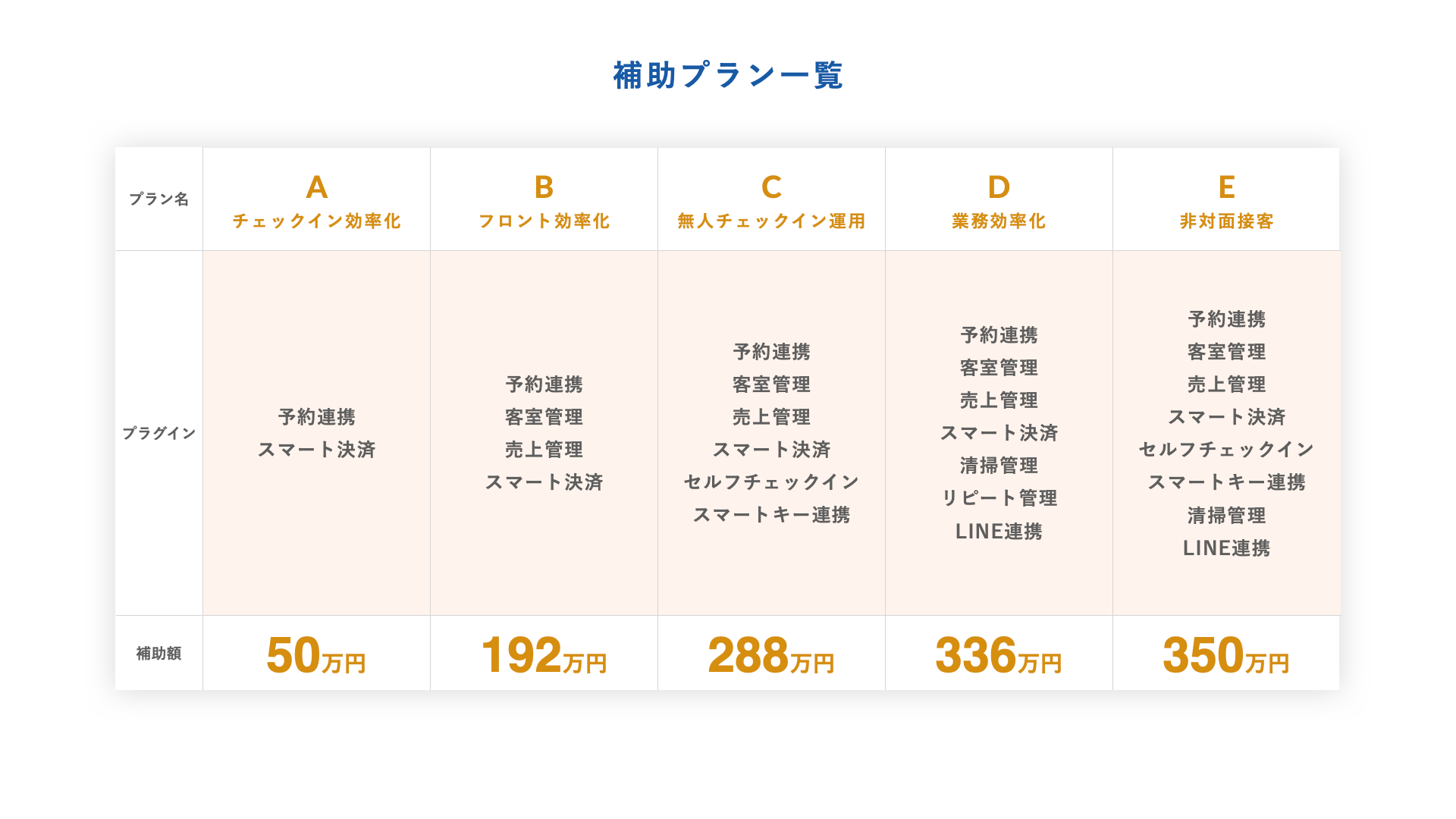 アイパスでは、事業者様の課題や実現したいことに合わせて「A. チェックイン効率化」「B. フロント効率化」「C. 無人チェックイン」「D. 業務効率化」「E. 非対面接触」の5つの補助プランを用意いたしました。プランごとに最大の補助額が変わります。弊社の担当者が事業者様のご要望に合わせて最適なプラグインの組み合わせを提案いたしますので、お気軽にご相談ください。