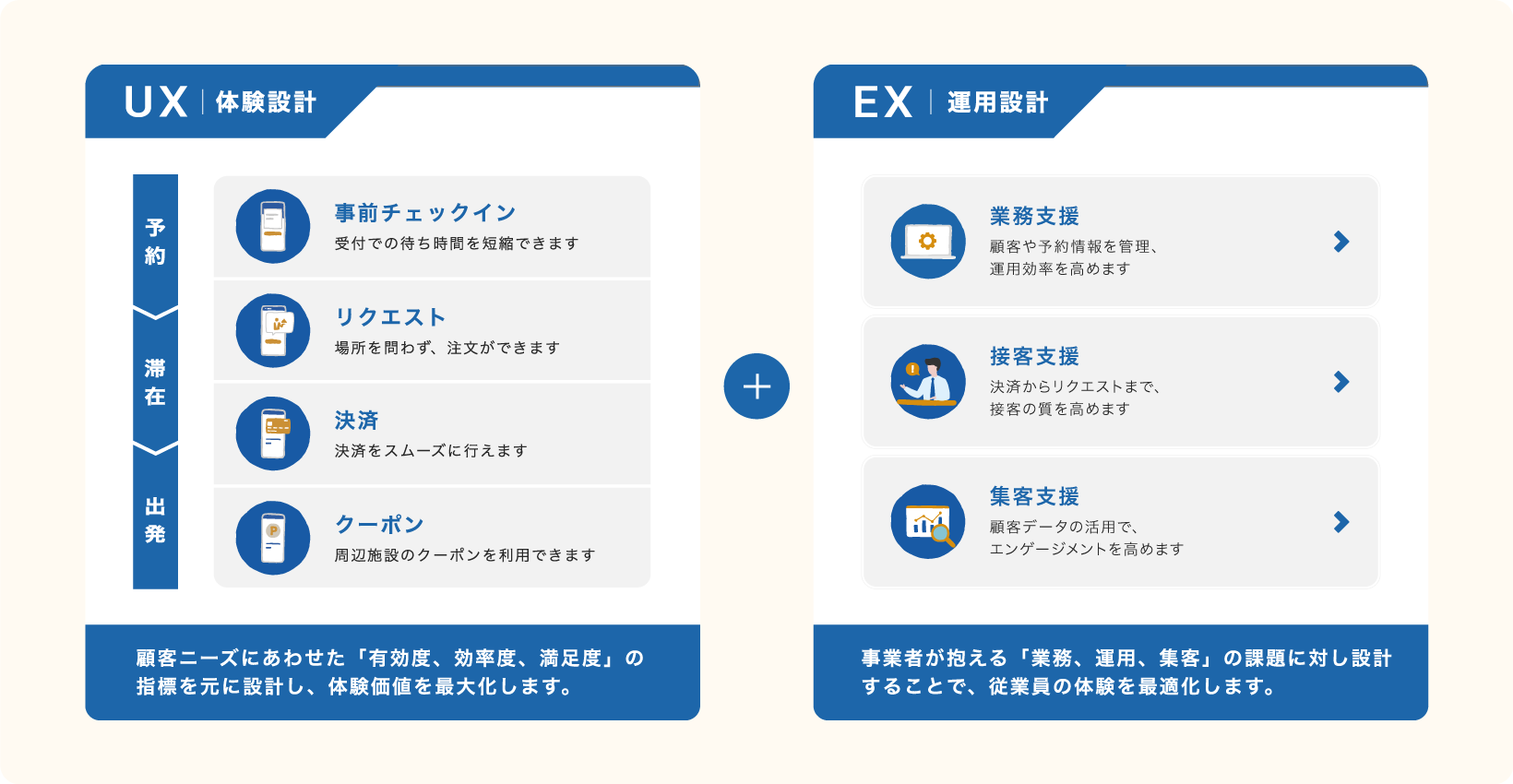 「UX(旅行者)とEX(従業員)」それぞれの体験を設計し、最適な機能を提供することで、経営課題を解決しDXを実現するシステムです。