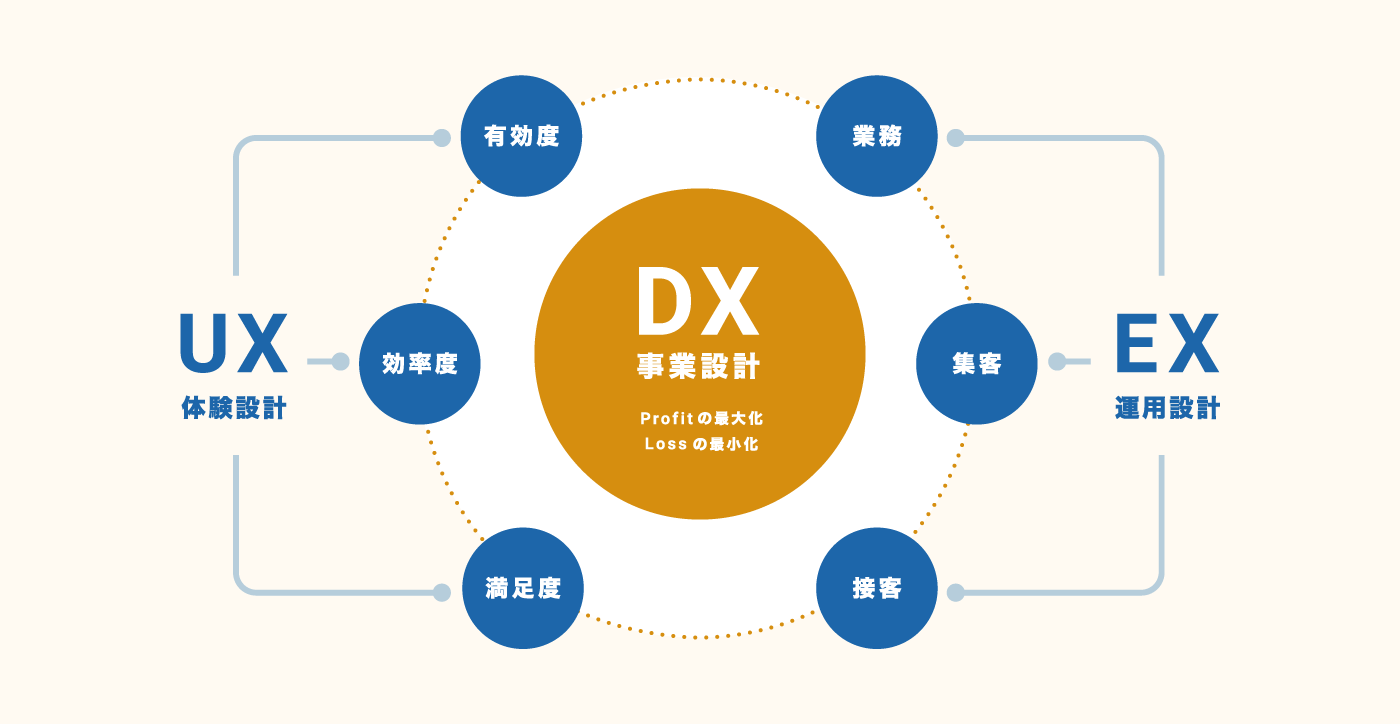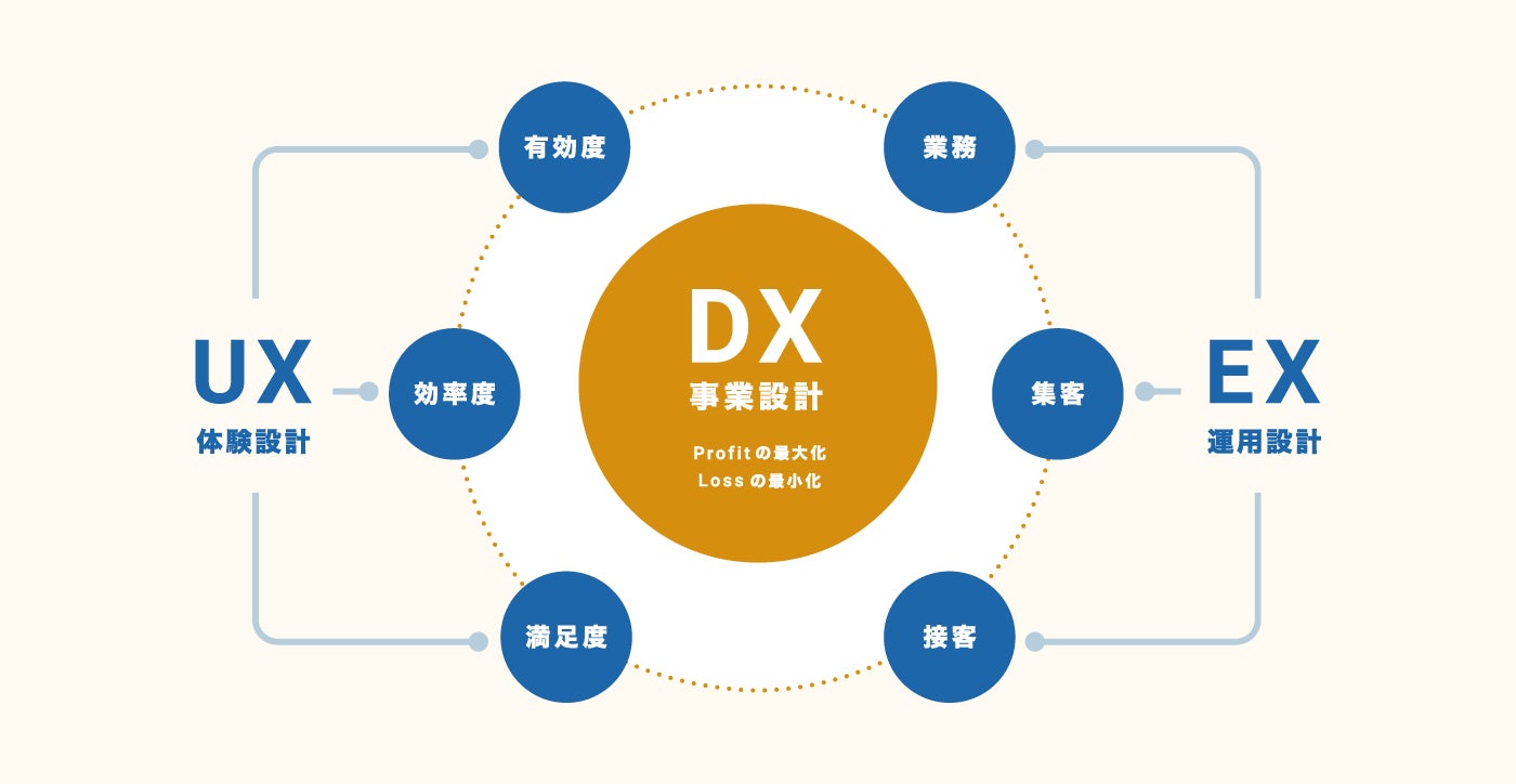 UXは「有効度、効率度、満足度」の指標をもとに、EXは「業務、運用、集客」の課題に対し設計することで体験を最適化します。