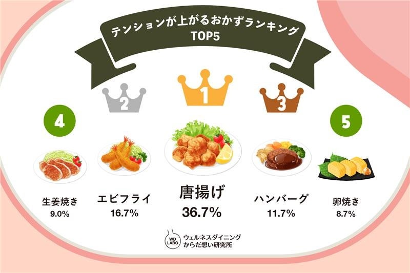 ✓ テンションが上がるおかず:1位 唐揚げ、2位 エビフライ