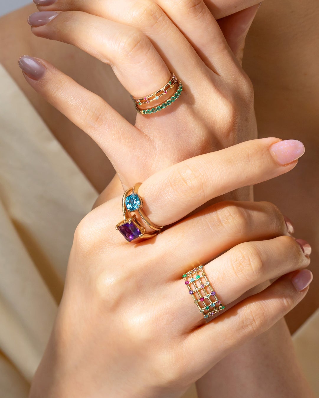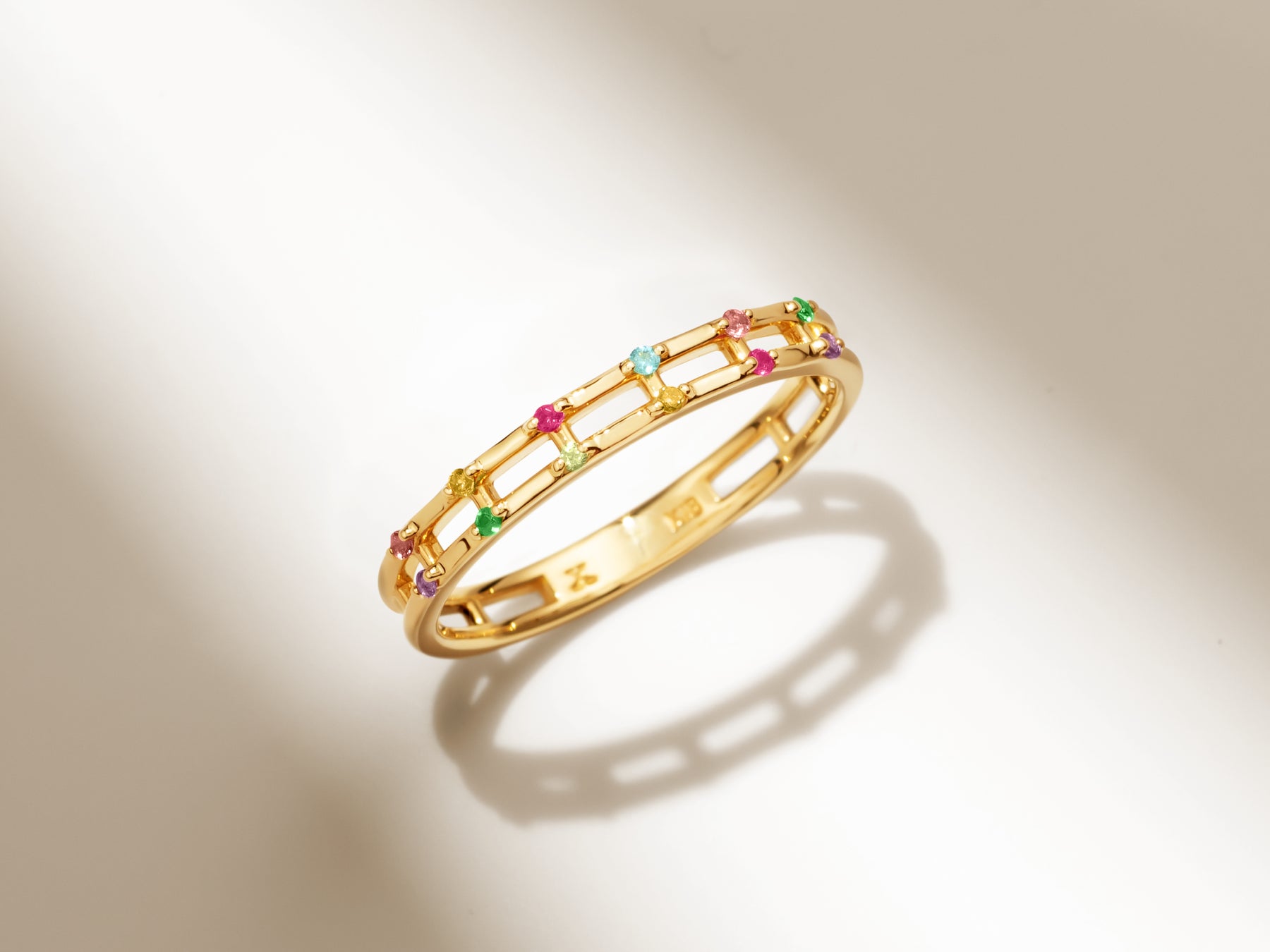 今回、「エマドット」コレクションには、新たにリング3種(内1種は店舗限定)・イヤーカフ1種・ブレスレット1種が加わります。「マルチカラージュエル K18/K10リング・エマドットL」は、繊細なラインはそのままに、ボリューム感ある約8mmのリング幅と、約1.5mmの宝石を24石使用した贅沢な作りが特徴。「マルチカラージュエル K18/K10リング・エマドットS」は、日常への取り入れやすさ、コーディネートのし易さを主軸に、繊細なラインを約1mmの12石の宝石で彩ったアイテムです。