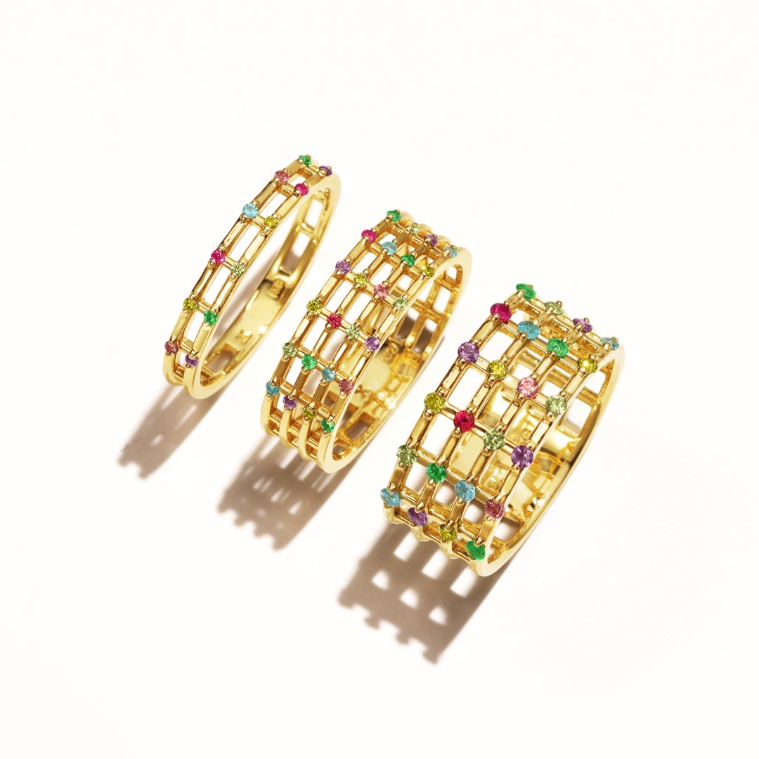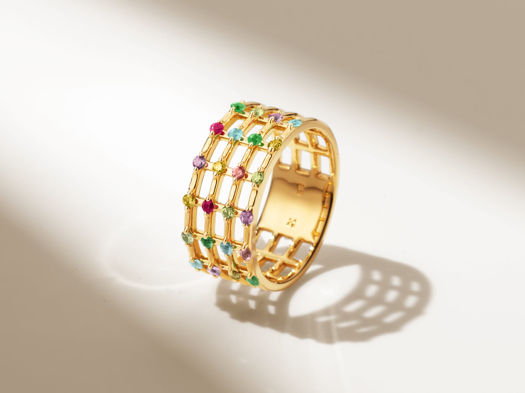 古来から親しまれてきたステンドグラスにインスピレーションを受け、デザインされたコレクション。約5mmの格子状のアームに、7種類の色鮮やかな宝石をスパイスのように散りばめた、繊細なデザインと職人技、宝石の煌めきの三位一体が魅力。光が透ける設計は、存在感がありながら軽やかな印象を与えてくれるアイテムです。