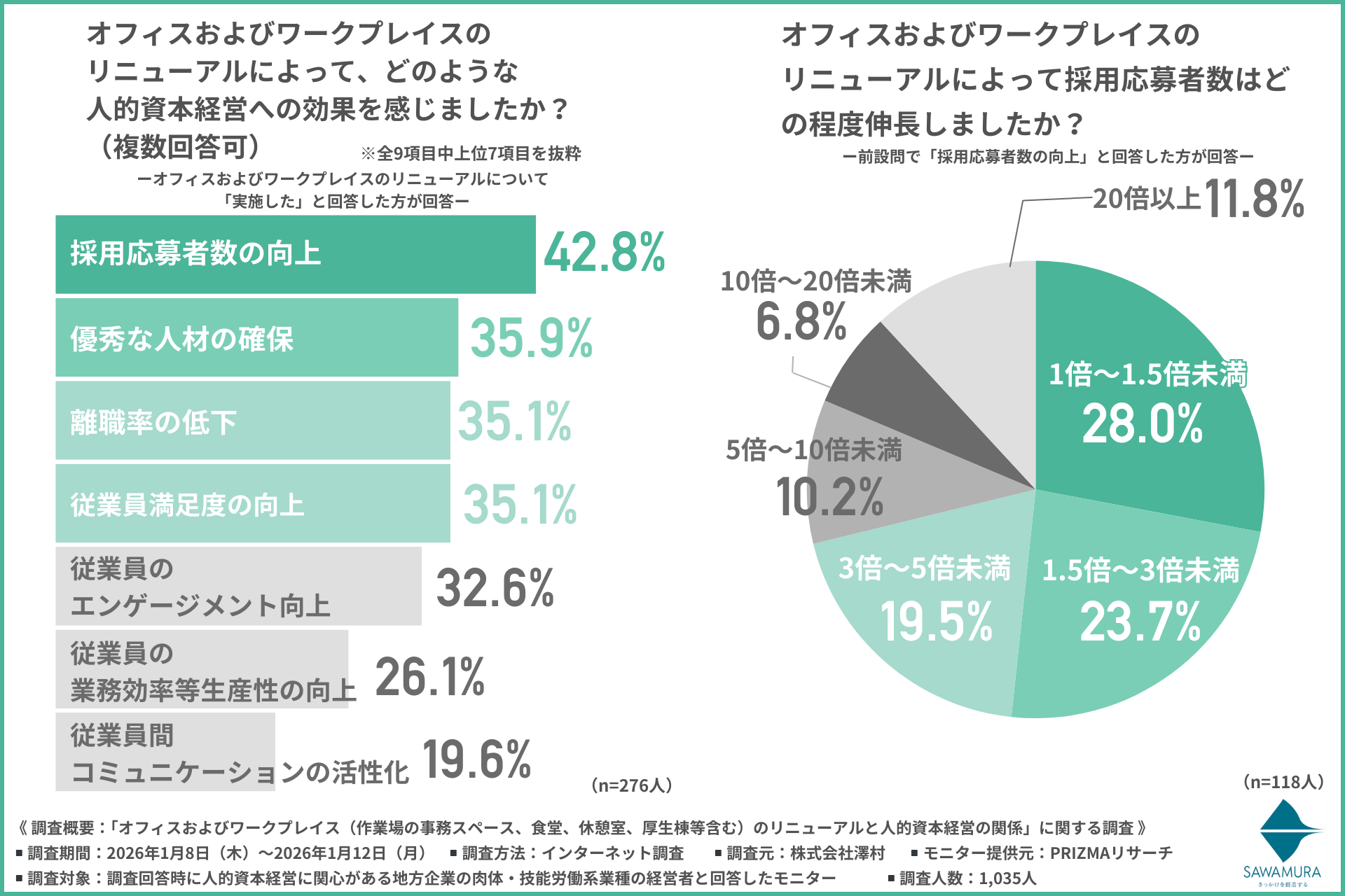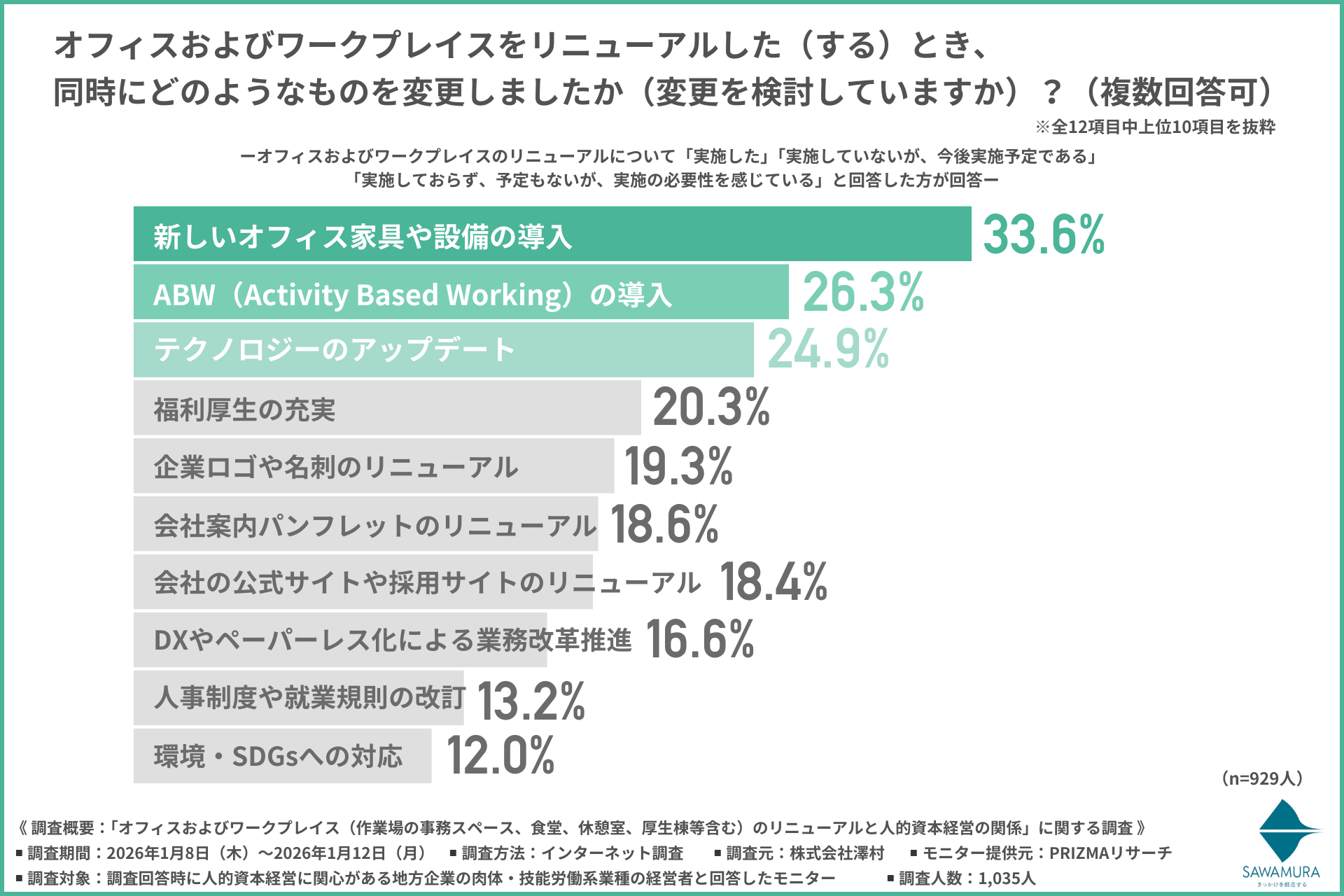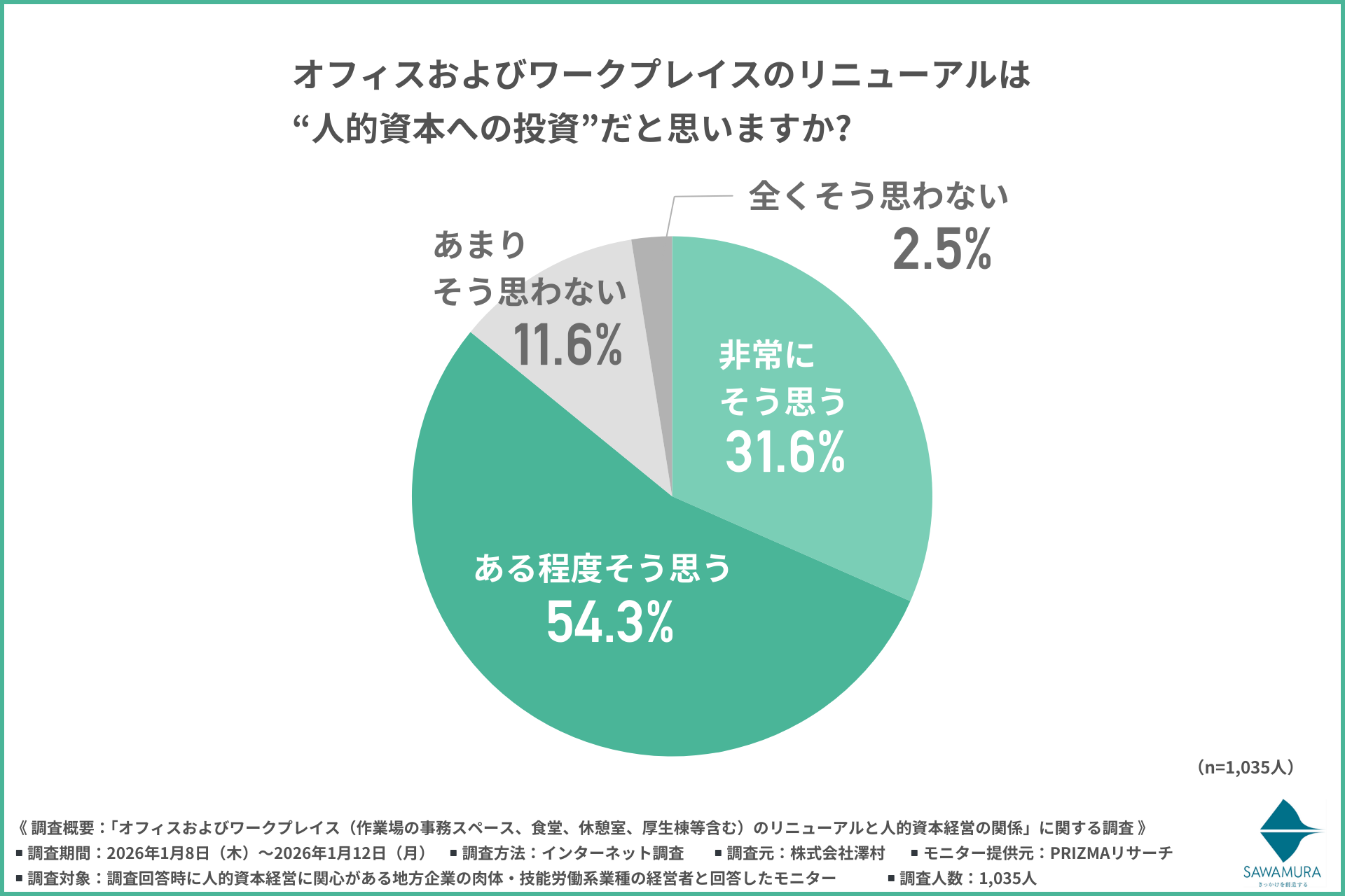 創業75年の総合建設業、株式会社澤村(本社:滋賀県高島市、代表取締役社長:澤村 幸一郎)は、人的資本経営に関心がある地方企業の肉体・技能労働系業種の経営者を対象に「オフィスおよびワークプレイス(作業場の事務スペース、食堂、休憩室、厚生棟等含む)のリニューアルと人的資本経営の関係」に関する調査を行いました。