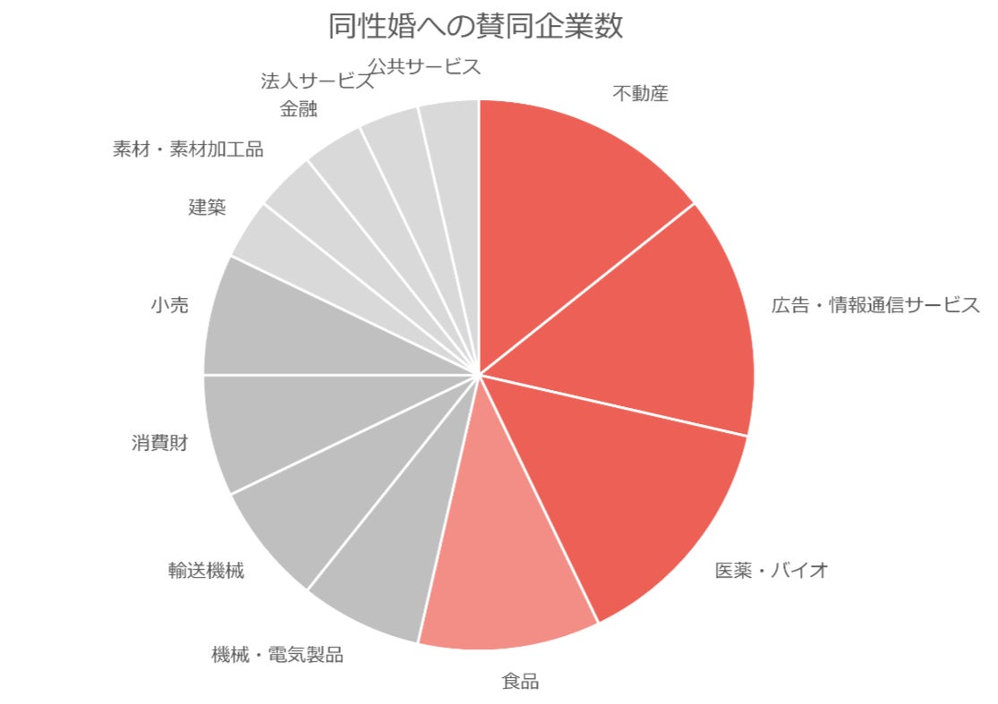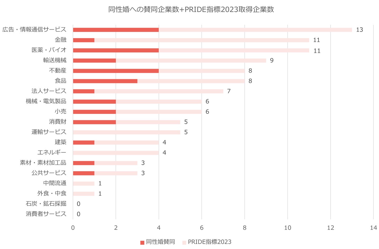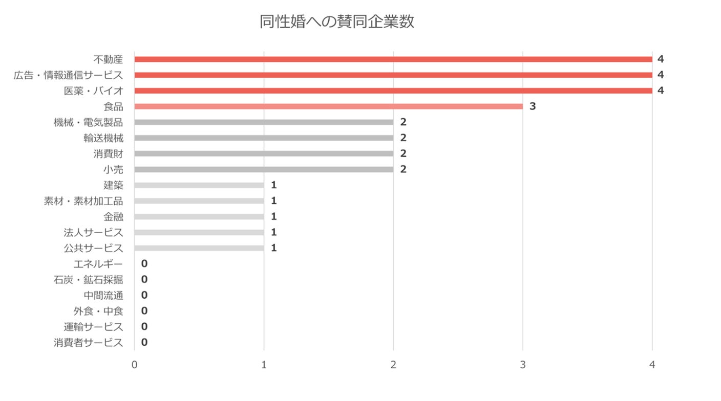 さらに、同性婚への賛同企業数との合計値を業種別でグラフ化したところ、上位3位は「広告・情報通信サービス(13)」「金融(11)」「医薬・バイオ(11)」となりました。