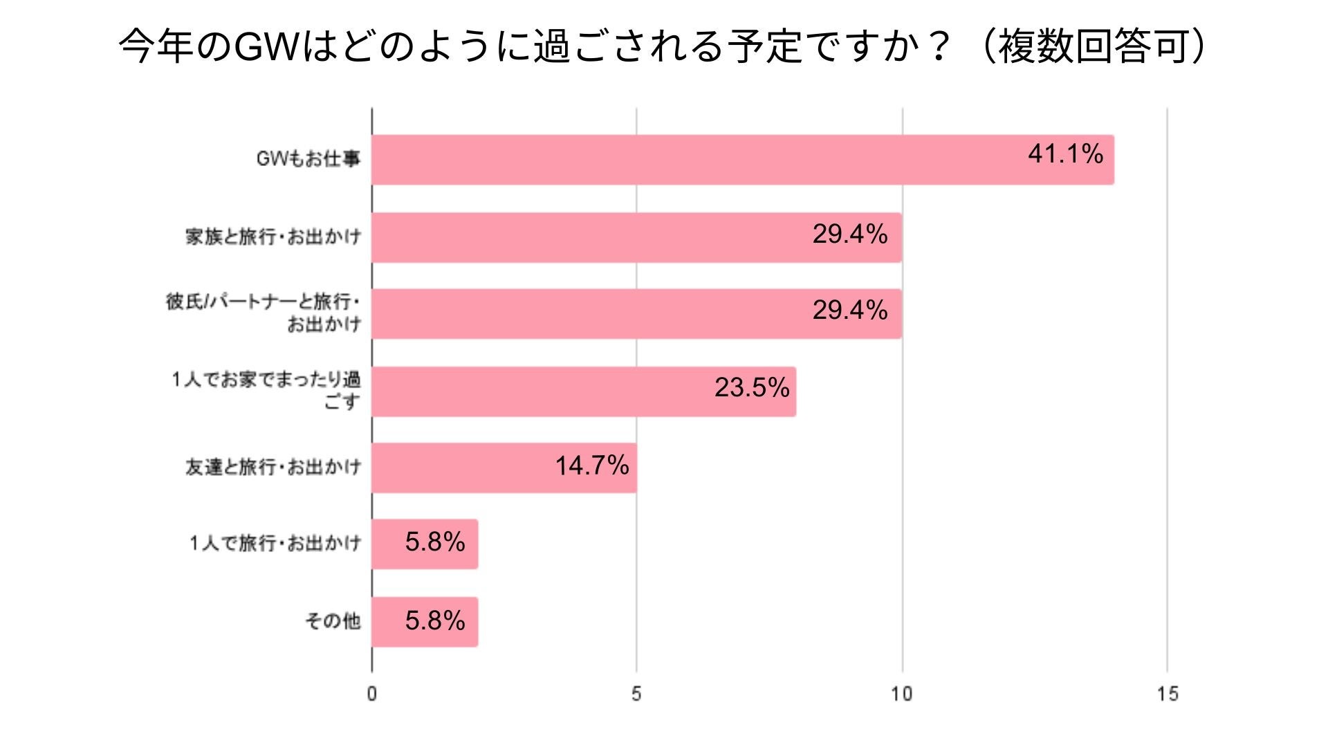 2. 今年のゴールデンウィークの過ごし方、第1位は「GWもお仕事(41.1%)」。第2位は「家族と旅行・お出かけ(29.4%)」と「彼氏/パートナーと旅行・お出かけ(29.4%)」。長期連休を機に出かける方は今年も多いようだが、当ユーザーに関してはGWも仕事という結果が上回っている。その他の回答では転職活動という回答もあげられた。