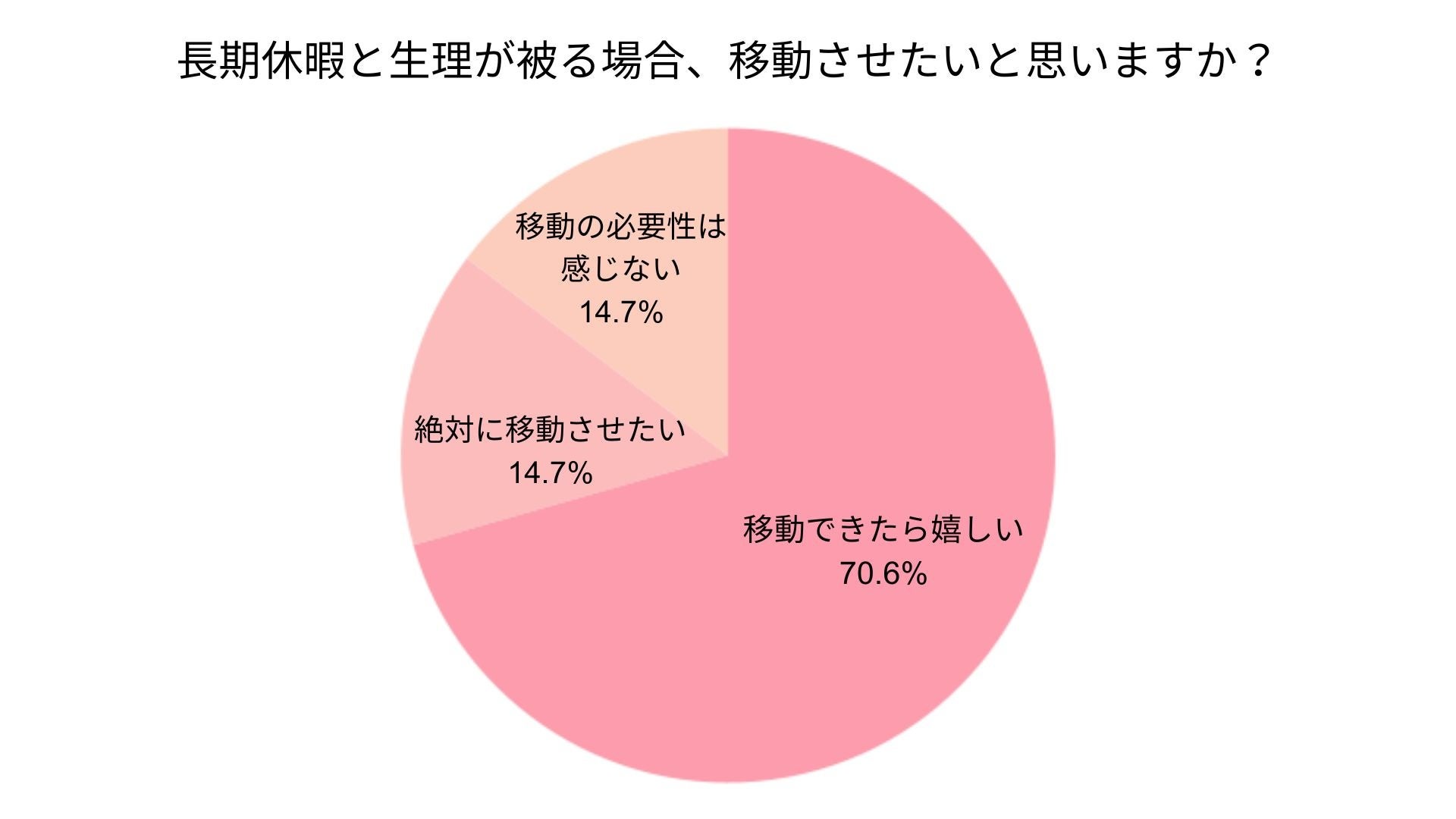 長期休暇に合わせた生理日移動について、「移動できたら嬉しい」「絶対に移動させたい」と回答した方は、合わせて約85%。被せたくないと言う割合が多い中でも「移動の必要性は感じない」という結果が14.7%に。