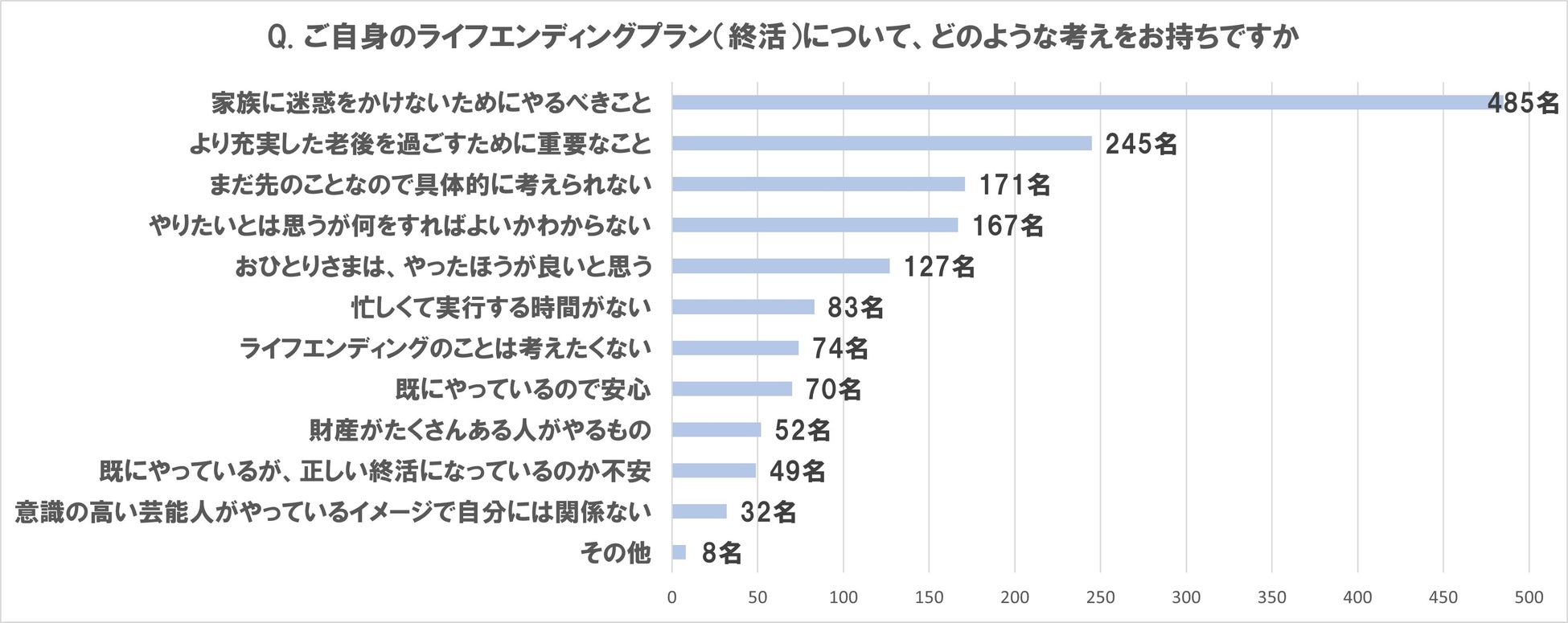 ■ご自身のライフエンディングプラン(終活)への考えは、1位「家族に迷惑をかけないためにやるべきこと」485名、2位「より充実した老後を過ごすために重要なこと」245名。