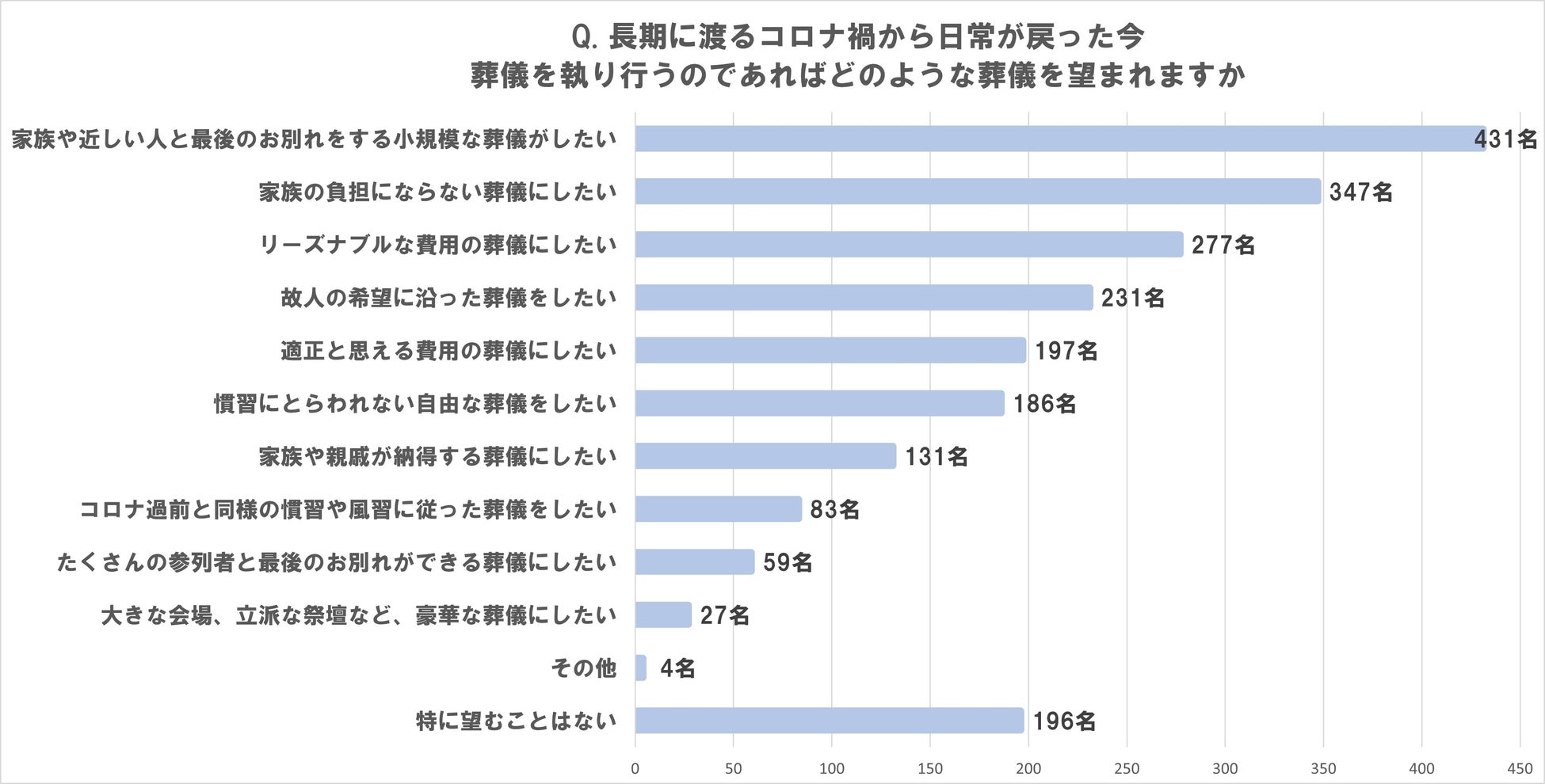 1位「家族や近しい人と最後のお別れをする小規模な葬儀」431名、
