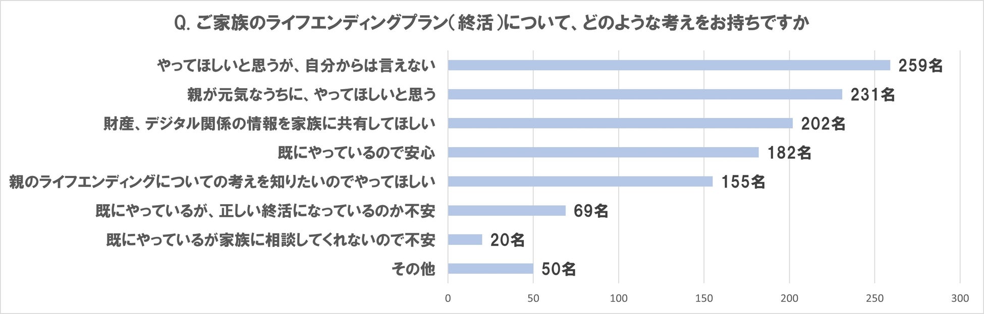 ■ご家族のライフエンディングプラン(終活)についてのお考えは、1位「やってほしいと思うが、自分からは言えない」259名、2位「親が元気なうちに、やってほしいと思う」231名、3位「財産、デジタル関係の情報を家族に共有してほしい」202名。